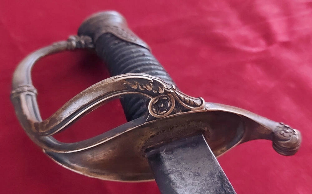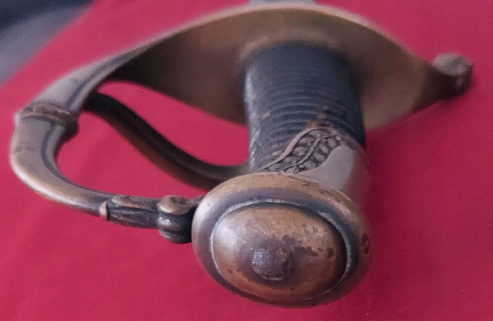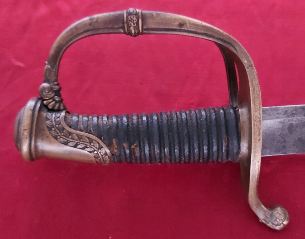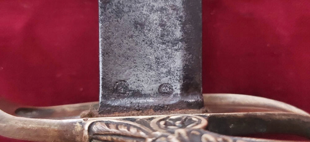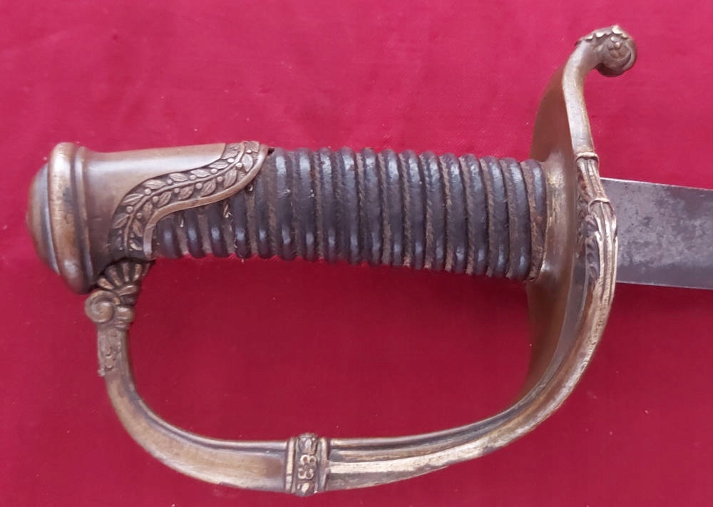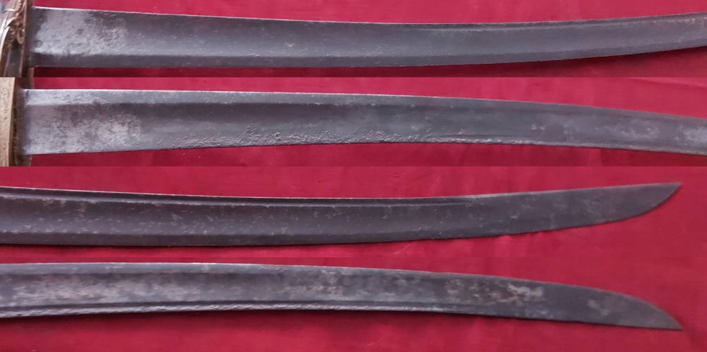 Копія, видна на фотографіях. Чудово збереглися. Лезо, незаселене, покрите темним покриттям, місцями поверхневими сторінками. Французькі підписи на порозі. Напис на потилиці, але трохи нерозбірливий. Світло -ручка латунна. Вал ручки покритий шкірою, бракує коси. Оброблена обробка