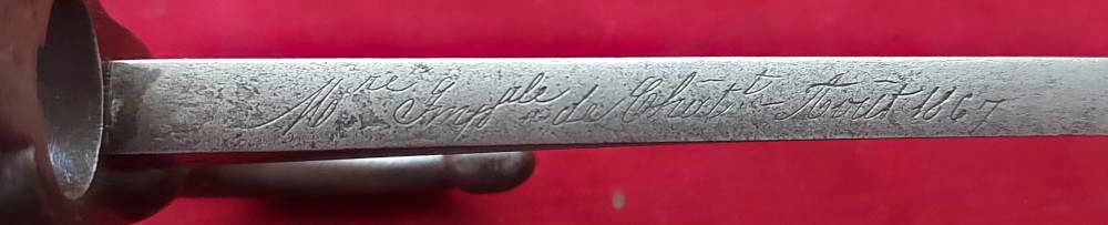 Копія, видна на фотографіях, добре збережена. Лезо рідкісне, ви можете побачити окремі функції заточення на ручці. Лезо покрите невеликою, поверхневою каші. Французькі підписи розбиті на порозі леза. На звороті леза є напис, семінар Chatellerault , рік виробництва 1867 . Підписи видно на JELC та ручці, включаючи число 15067 . Ручка - латунь, замок для багнети функціональний.