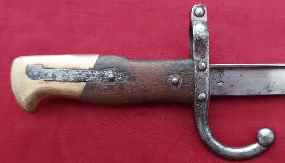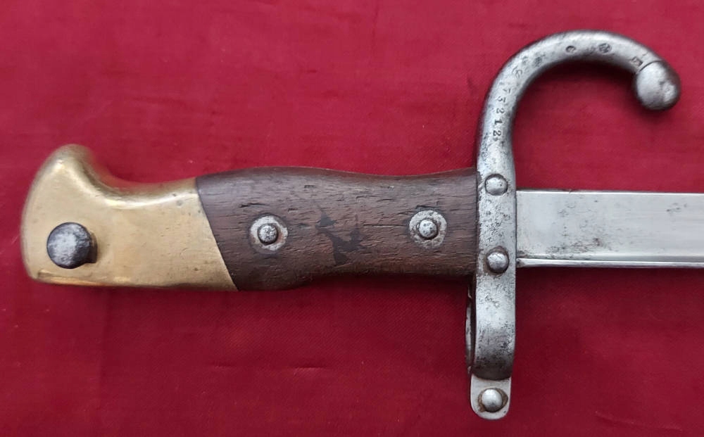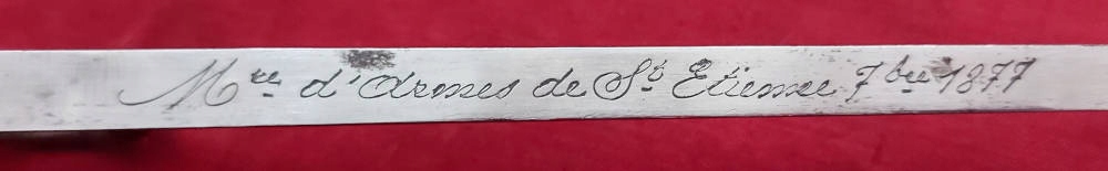 Копія, видна на фотографіях, дуже добре збережена. Лезо без обсягу і не торкається. Французькі підписи були порушені на порозі леза. Чіткий напис на задній частині голови виготовляє ST. Etienne , рік виробництва 1877 . Замок Bayonet функціональний. Голова латунна, підписи, видно в посібнику. Дерев’яна, оригінальна обшивка ручки. На JELC число 73212 та французькі підписи.