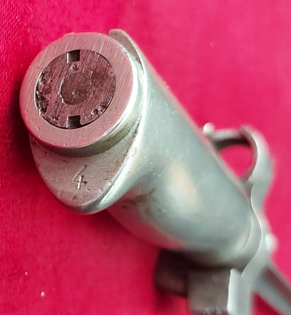 Копія, видна на фотографіях, добре збережена. Лезо безкомплектовано, а не камінь, має невеликі сторінки. На порозі леза, підпис c & p . Замок Bayonet функціональний. Ручка - Мельхіорова. Номер 4 було зламано на голові. На JELC число розмито.