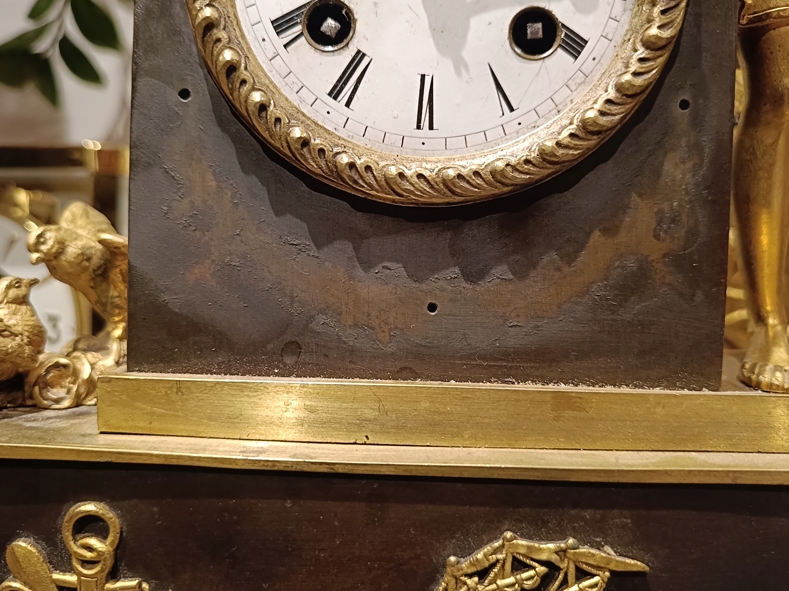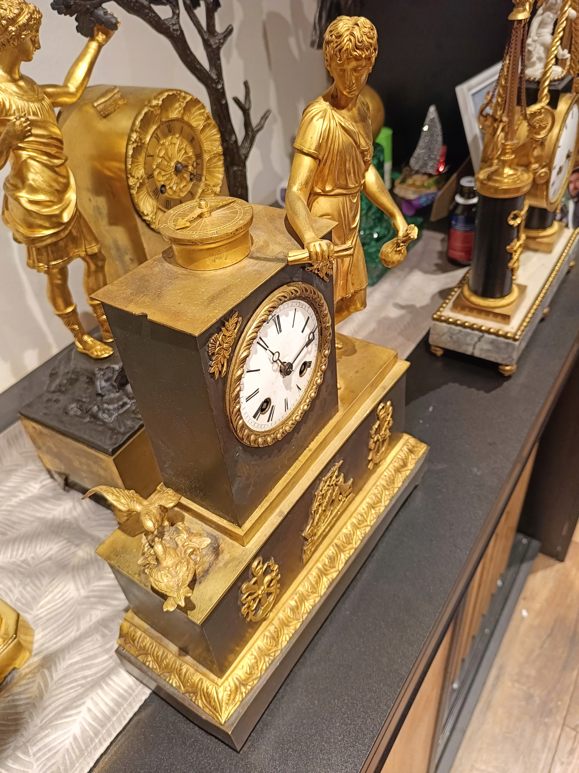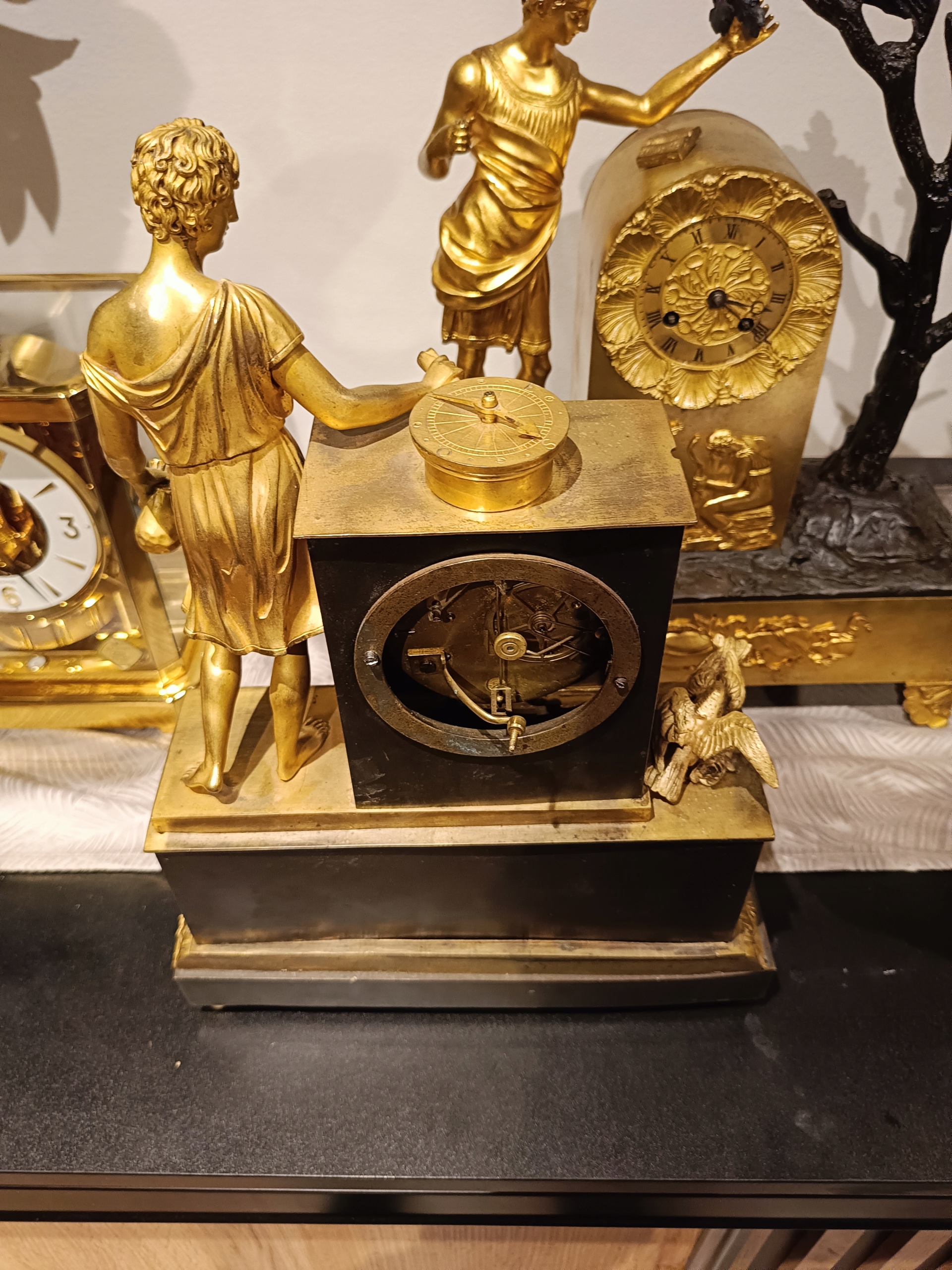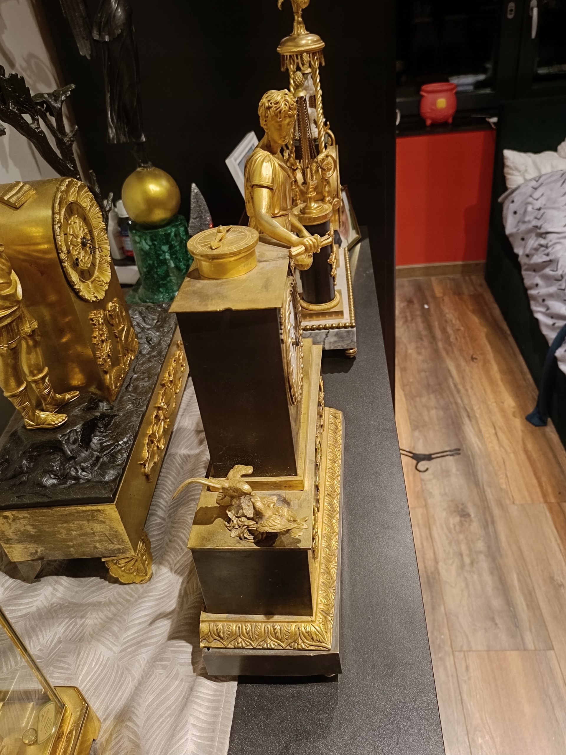 Продам дуже гарний камінний годинник у стилі ампір. Є запитання - 518+636-752. Походження: Франція - перша половина 19 століття. Годинник з позолоченої та патинованої бронзи. Механізм працює ідеально, укомплектований та в хорошому стані, відбиває години та півгодини. В комплект входить ключ-маятник (не оригінал) і дзвіночок. Циферблат механізму в відносно хорошому стані - був невеликий скол на положенні 12 годин. Відсутня прикраса під механізмом. Ніжки не оригінальні. Один можна виготовити на токарному верстаті. Пташки ніби з іншого годинника, хоча я купив годинник разом з ними.