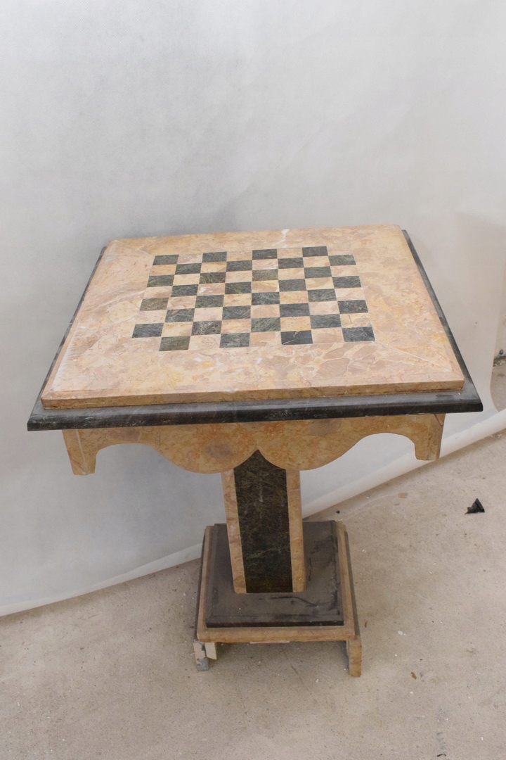 Поверхня столу має гарну шахову дошку з різних видів мармуру контрастних кольорів, що надає йому унікального вигляду. характер. Ця витончена шахівниця не тільки забезпечує чудову ігрову поверхню, але й є привабливим декоративним елементом.