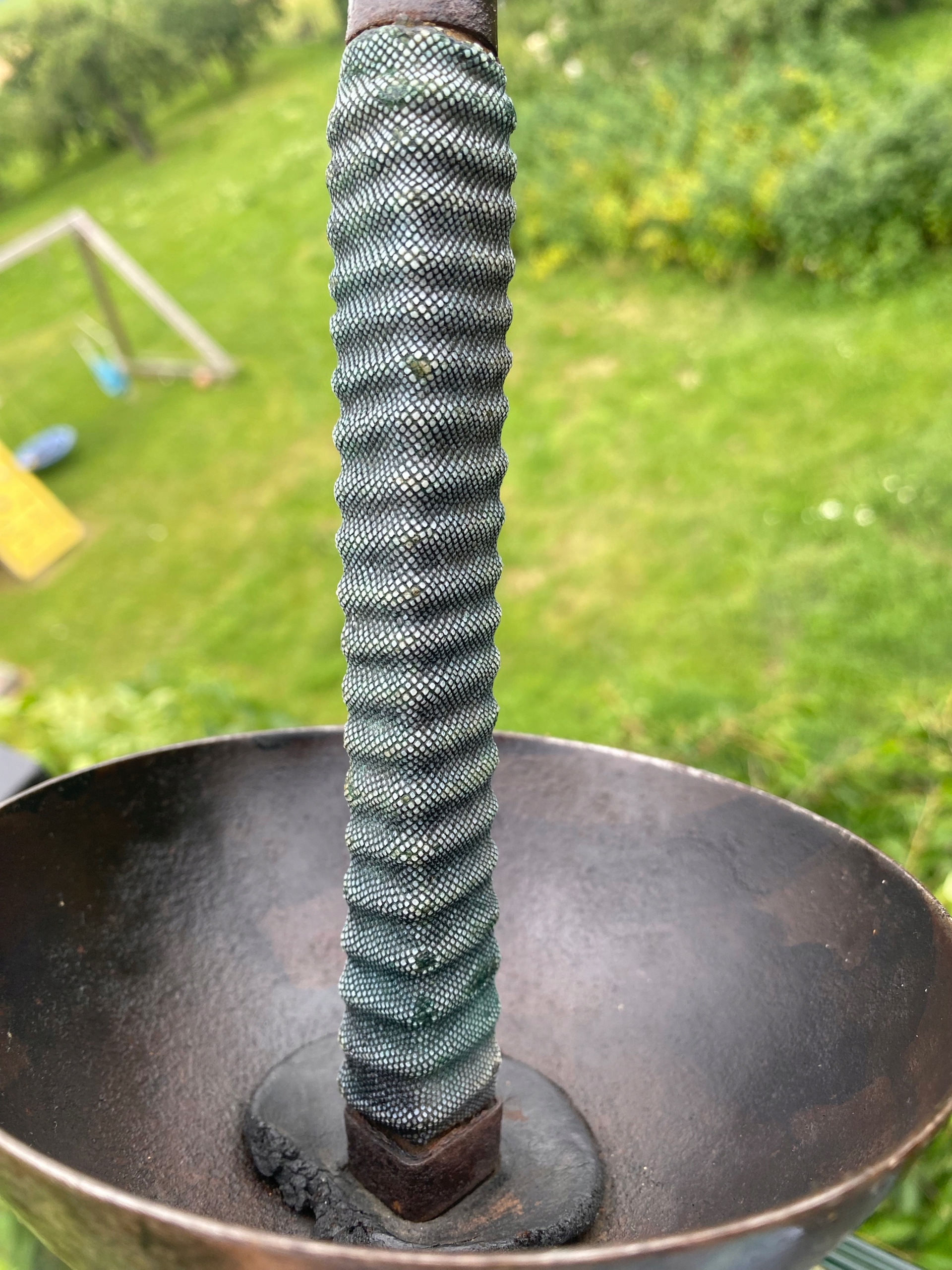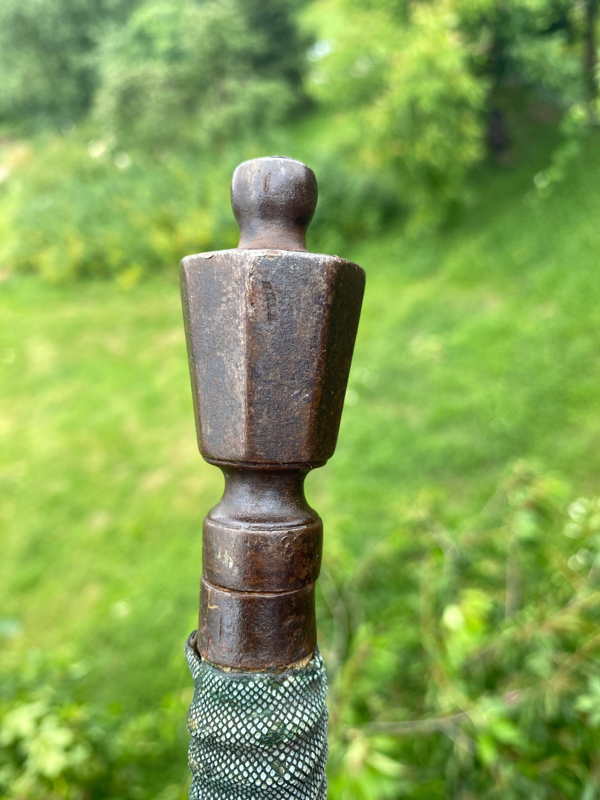 Ручка ручки, виготовленої з дерева, покрита ящіркою з дуже приємним морським кольором, видно на знімках.