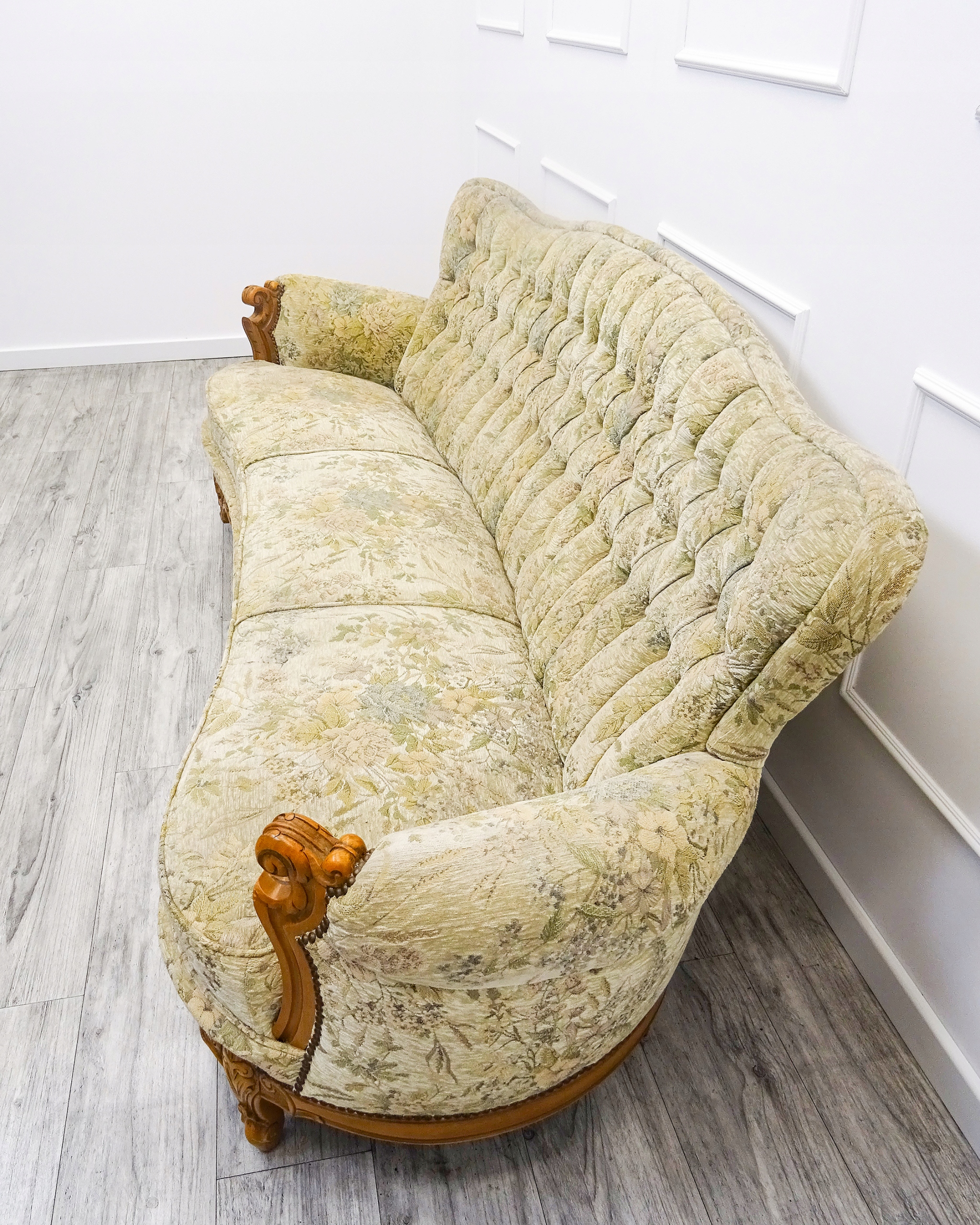 Набір суцільних дерев’яних меблів для вітальні - французькі меблі -стилі - Людвік | 1960 -ті роки: Франція). > Оббивка - світло -зелена тканина з багатим квітковим малюнком. М'які підлокітники та декоративна вставка на передній частині спини. Сидіння на зручних, м’яких подушках (нерухома) - пружини для рук для найвищого сидіння.