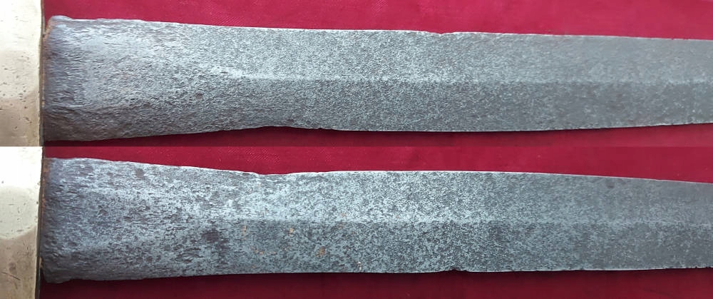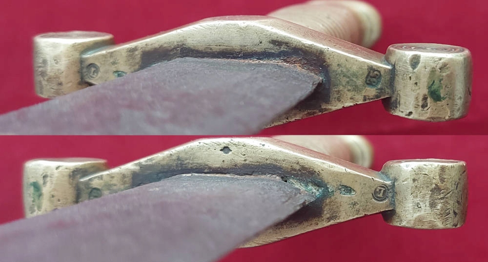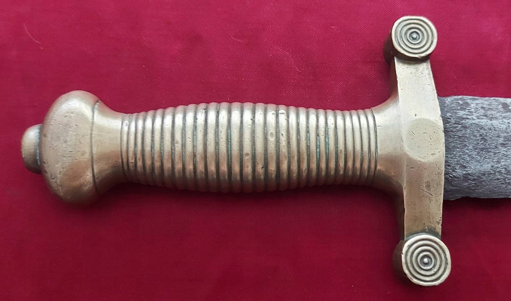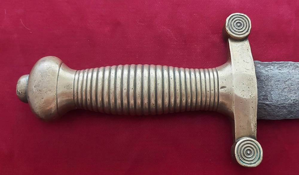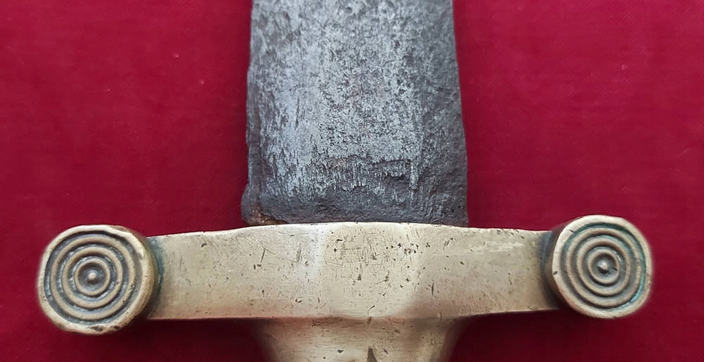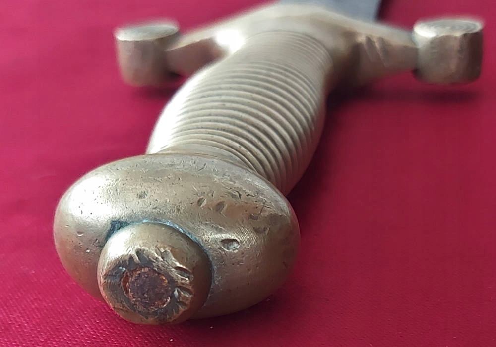 Копія, видна на фотографіях, добре збережена. Нефарбоване лезо, заточене в епоху. Покритий поверхневою корозією. Лезо трохи спотворене. Ручка - латунь. Немає слабкої.