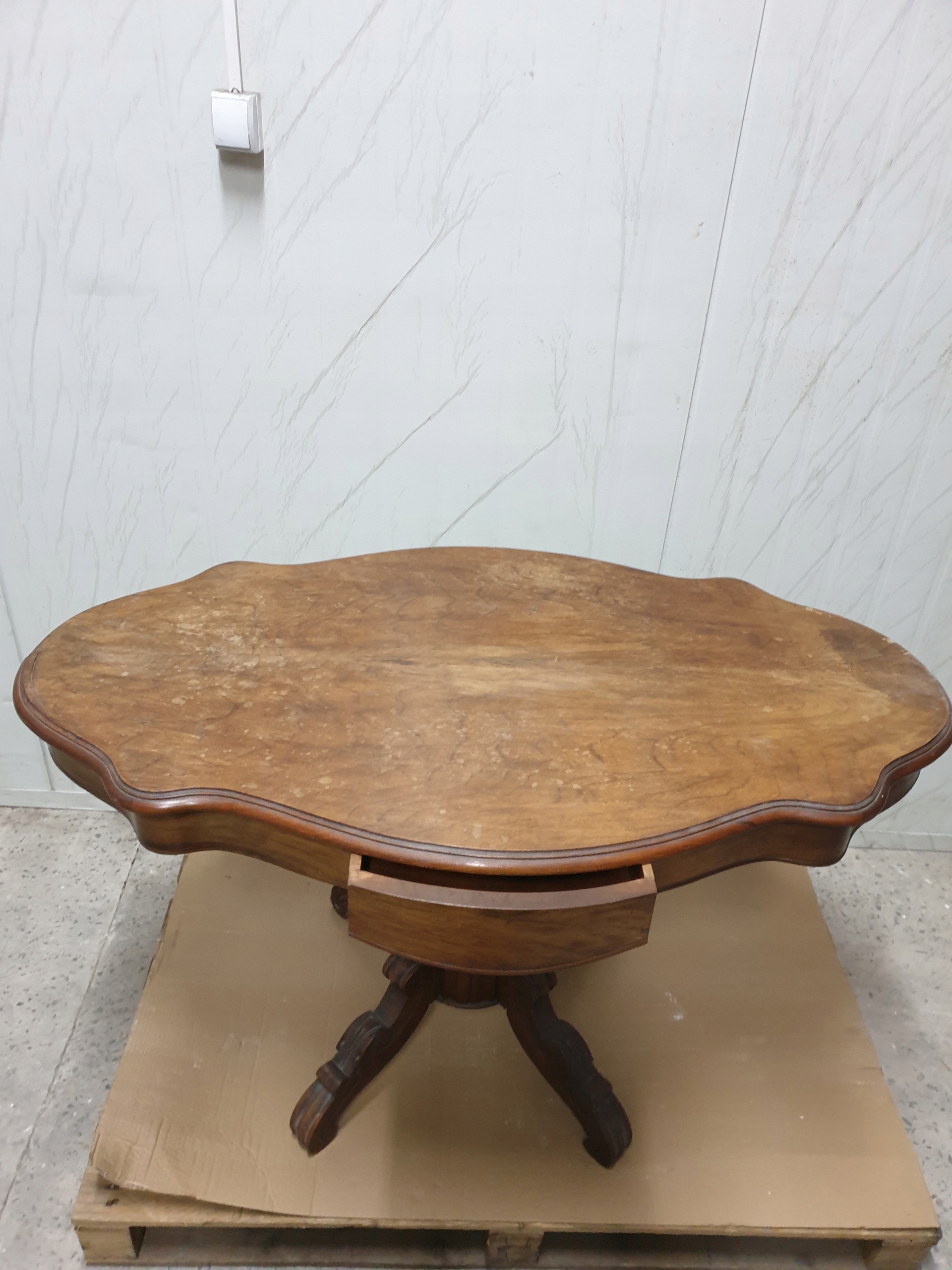 Предметом аукціону є красивий стіл для вітальні з дерев'яною стільницею та чотирма різьбленими ніжками. Має дві бічні шухляди.