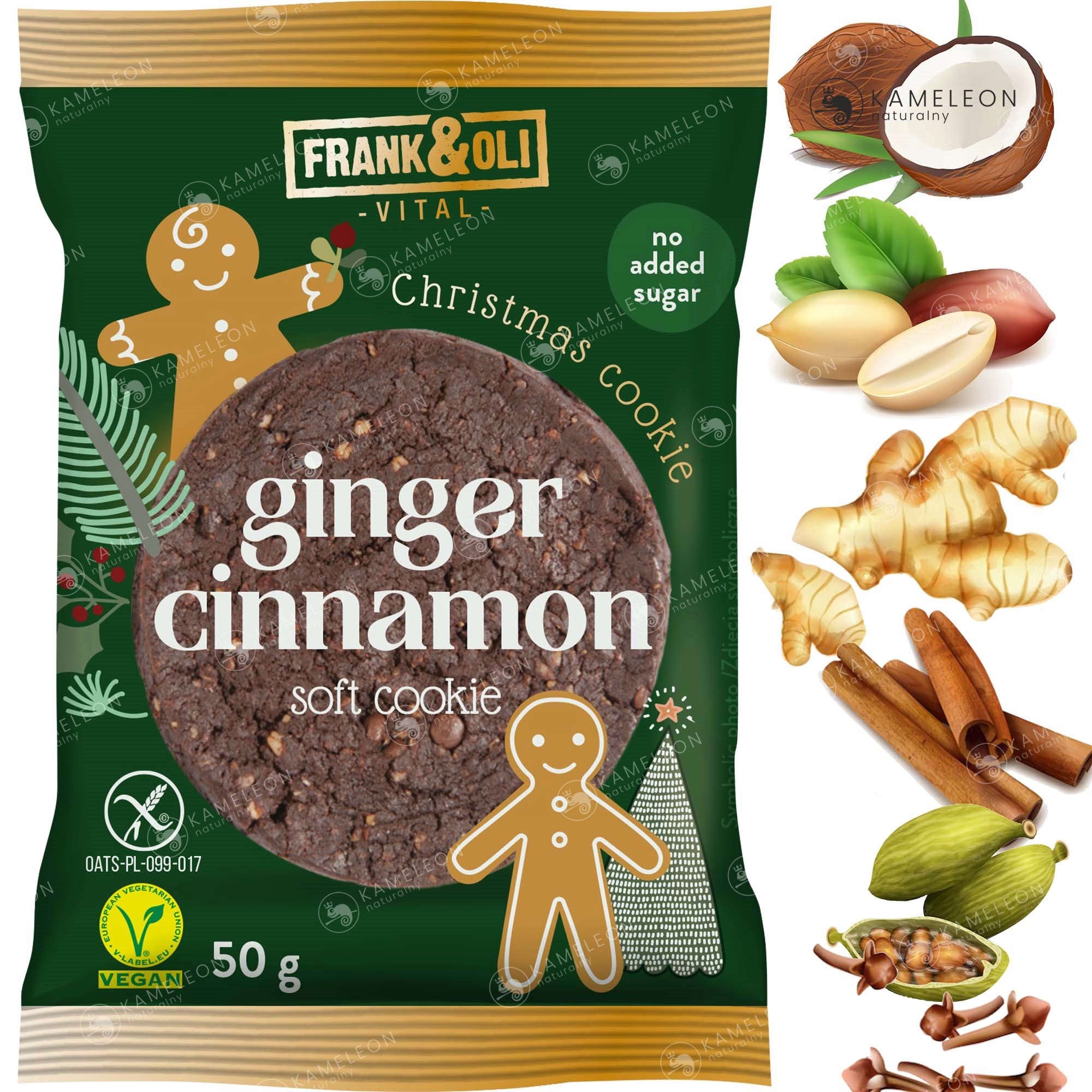 коренева клітковина цикорію, м'якоть кокоса, м'якоть арахісу, безглютенові вівсяні пластівці, арахіс борошно, підсолоджувач: мальтит, какао 4%, кориця 1%, імбир 0,7%, гімалайська сіль, кардамон 0,5%, гвоздика 0,4%, натуральний ароматизатор