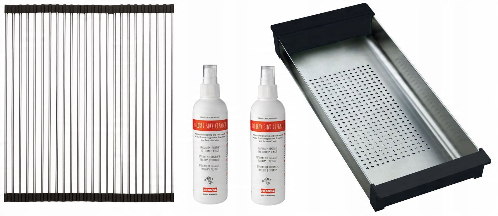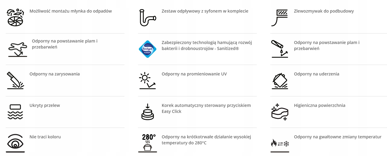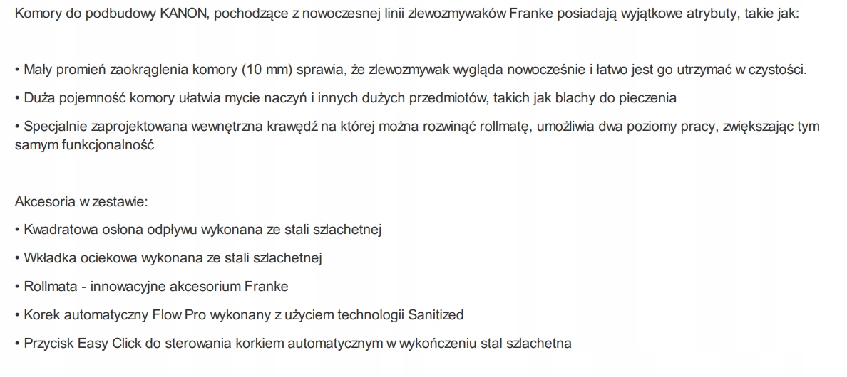 - Аксесуари в комплекті: сифон, рулонний килимок, крапельна вставка, автоматична заглушка Flow Pro, кнопка Easy Click для керування автоматичним стопором, обробка з нержавіючої сталі