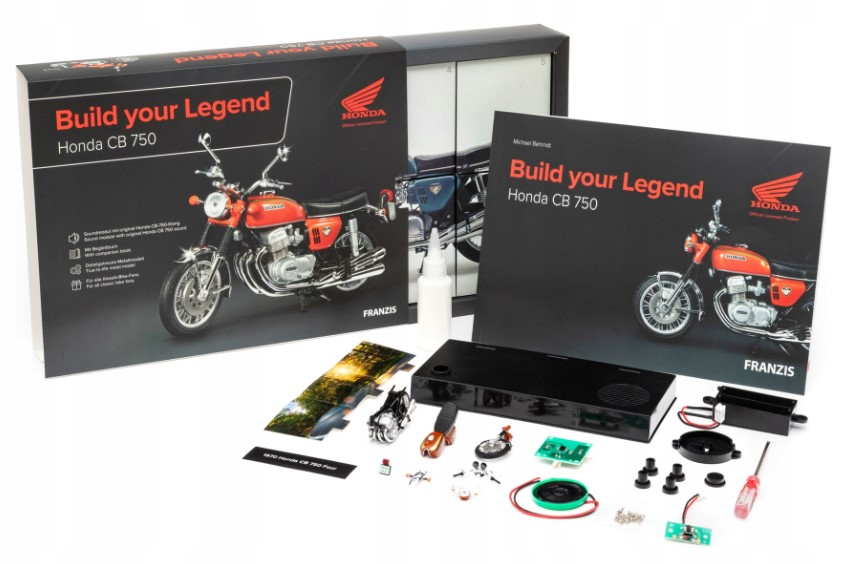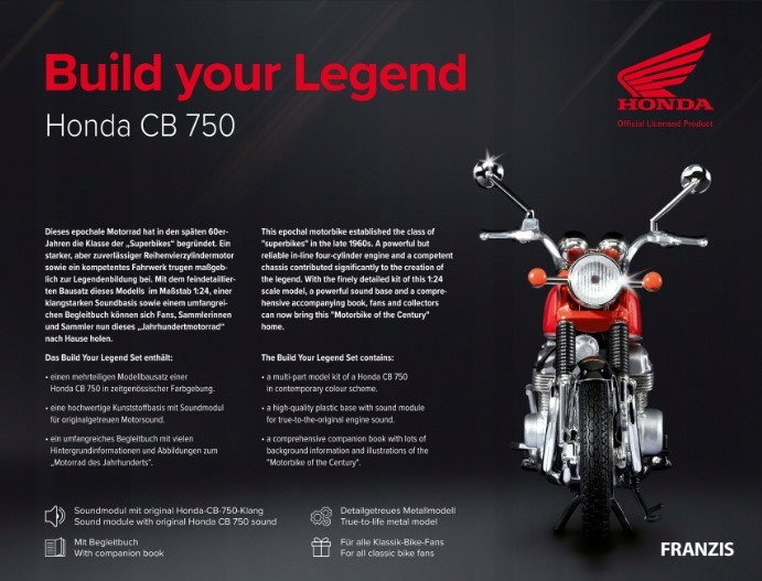 Мрія у вас під рукою, ваша власна Honda CB 750 1970 року. Franzis робить це можливим завдяки набору Honda 750 *Build your Legend* у масштабі 1:24. Завдяки цьому надзвичайно успішному, епохальному мотоциклу Honda створила клас «супербайк». Потрібен був класично збалансований, позачасовий дизайн, потужний і надійний рядний чотирициліндровий двигун і грамотне, добре збалансоване шасі. Завдяки детальному набору та потужній звуковій базі, а також великій супутній книзі Franzis шанувальники та колекціонери можуть взяти цей «байк століття» додому.