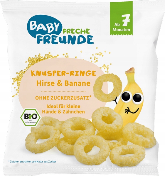 біо чіпсів, пшоно з бананами, призначеними для дітей із 7 місяців вік. Зроблено з кукурудзяного борошна без глютену, багатих на каротиноїд-природних барвників з антиоксидантними властивостями, які захищають організм від вільних радикалів. Крім того, кукурудзяне борошно є хорошим джерелом заліза, магнію, цинку та фольги. Просо, що міститься в хрустках з точки зору харчової вартості, відповідає гречанню. У ньому маленький крохмаль, але багато білка, який легко засвоюється. Він відрізняється найвищим вмістом вітамінів В: В1 (тіамін), В2 (рибофлавін) та В6 (піридоксини), а також заліза та міді. Додавання бананів збагачує хрустки не лише смаком. Хрустки легкі та делікатні, в мить оці вони тануть у маленькому обличчі. Додавання цукру