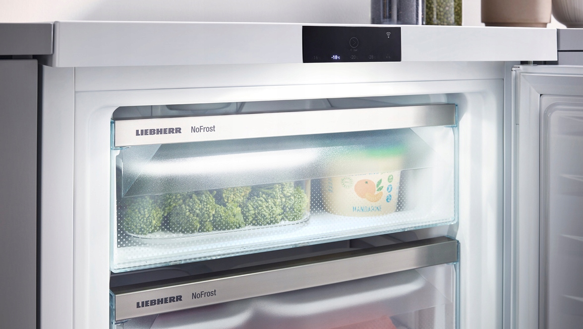 Коли ви відкриваєте висувні шухляди в морозильній камері Liebherr, вас вітає не тільки вид продуктів, але й привабливе освітлення: воно забезпечується потужними, довговічними та екологічно чистими світлодіодами. Освітлення полегшує перегляд вмісту, а також є привабливим елементом зовнішнього вигляду.