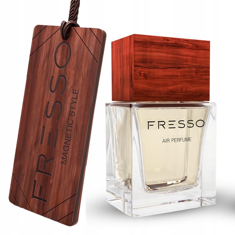 Набір смачних освіжувачів салону автомобіля. Він складається з елегантної дерев'яної підвіски FRESSO, просоченої унікальною ароматичною композицією, що нагадує запах справжніх парфумів. Ароматна підвіска Fresso прикрашена коричневою плетеною ниткою, що робить її елегантною в інтер'єрі будь-якого автомобіля. У набір також входить флакон парфумів об'ємом 50 мл з такою ж ароматною композицією. Парфуми можна використовувати для розпилення килимів, килимів або автомобільних сидінь, а також дерев’яних підвісок, коли запах перестане бути інтенсивним.