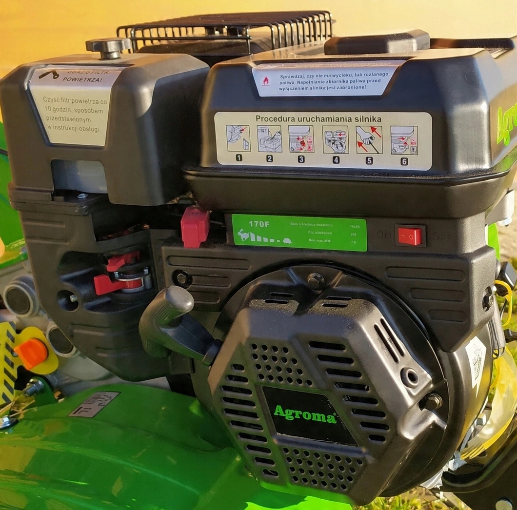 T7080L3GE оснащений двигуном потужністю 208см³ з потужністю понад 7 к.с. і ЕЛЕКТРОСТАРТЕРОМ. Суцільна коробка передач з металевими шестернями - гарантія найвищої якості. Використання вологого повітря фільтр в масляній ванні в моделі T7080L3G істотно підтримує роботу румпеля. Машина має коробку передач з металевим корпусом, яка контролює 3 передачі (2 швидкості вперед і 1 швидкість назад). Передні швидкості дозволяють ефективно обробляти ґрунт, а після встановлення колеса гумові (є в комплекті) або сталеві, працювати з додатковими аксесуарами, такими як плуг, культиватор або борона (найбільший вибір на ринку!). Фертоблок Agroma T7080L3G також пристосований для встановленняпричепа-фургона з сидінням, який стане транспортним засобом для перевезення різних сільськогосподарських вантажів.