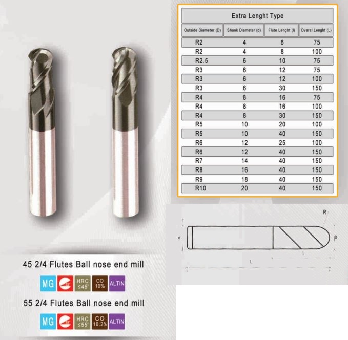 2-зубчаста твердосплавна кулькова фреза R2,5 мм 45HRC