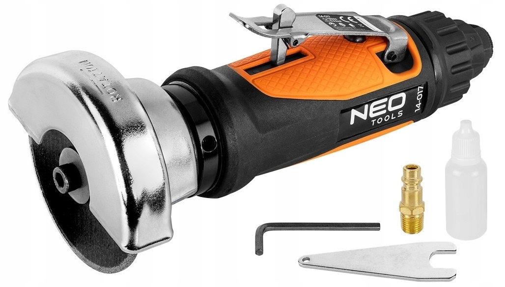 Пневморізка 75 мм 14-017 фірми NEO - це інструмент з диском діаметром 75 мм. Характеризується частотою обертання 18 000 об/хв і середньою витратою повітря 115 л/хв. Працює при максимальному тиску 6,3 бар. Фреза оснащена роз'ємом 1/4". Це ергономічний і легкий інструмент, вагою всього 0,82 кг. Він сертифікований CE. Фреза рекомендована для різання кузова, листового металу та металу.