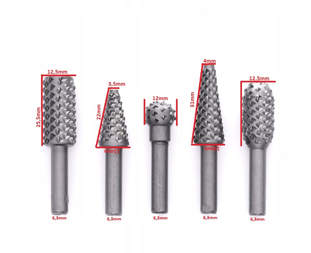 Набір із п’яти рашпілів із хвостовиком, призначений для базової обробки деревини, пластмас та інших подібних м’яких матеріалів.