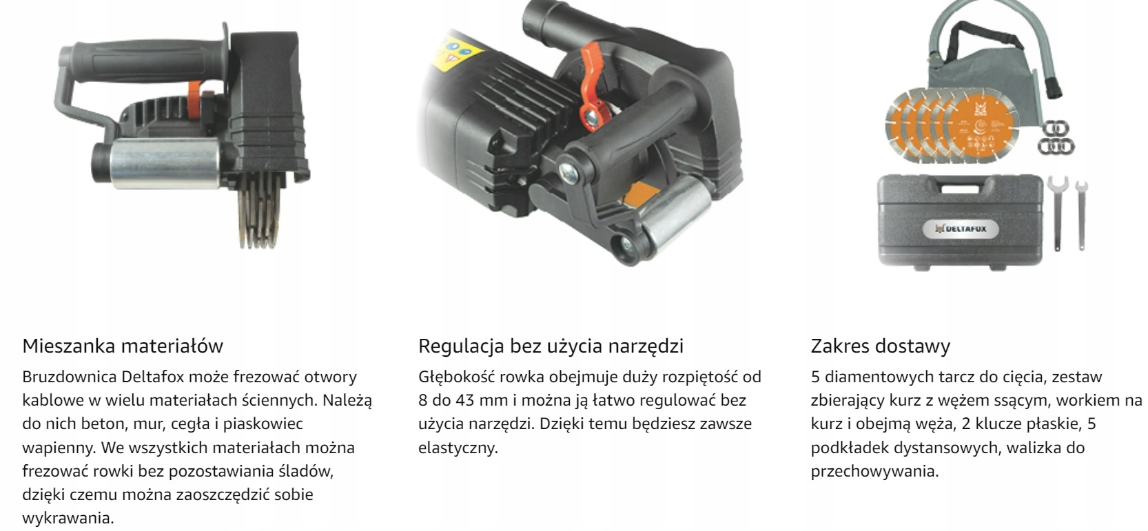 Використовуючи фрезу Deltafox DP-EWC 2415, ви можете легко фрезерувати стінні отвори для встановлення електричних кабелів. Цей стіноріз дозволяє змінювати ширину щілини 8-26 мм і глибину щілини 8-43 мм у горизонтальному або вертикальному напрямку. Потужний двигун потужністю 2400 Вт і частотою обертання 8000 об / хв приводить в рух 2-5 відрізних дисків. Пази фрезеровані в стіні, тому її не потрібно виривати. Стіноріз оснащено всмоктуючим патрубком.