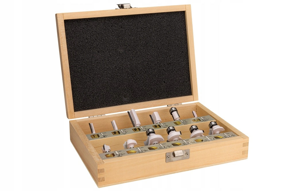 Набір із 12 фрез із міцного та стійкого до стирання матеріалу. Фрези підходять для точної обробки деревини. 12 різних варіантів на вибір. Набір був упакований в дерев'яну коробку.