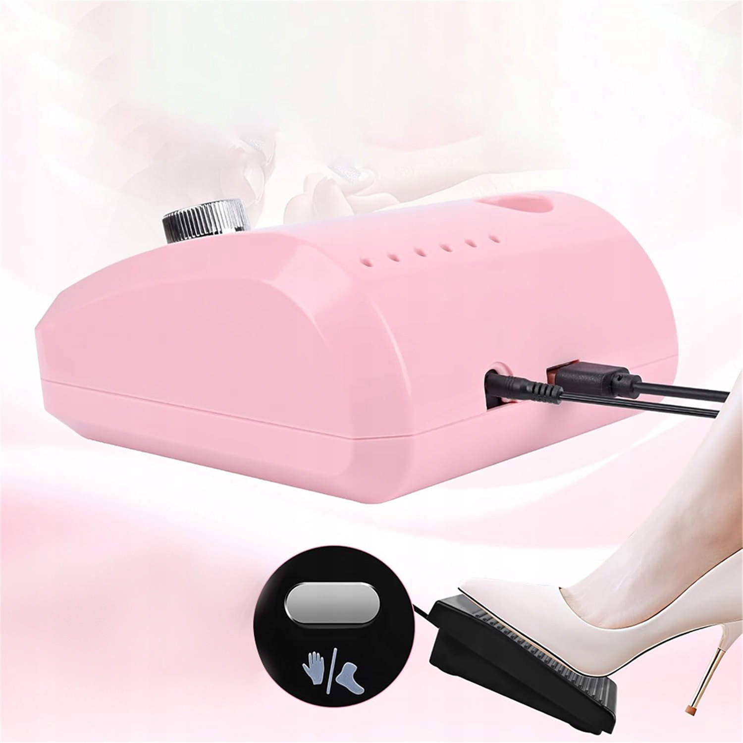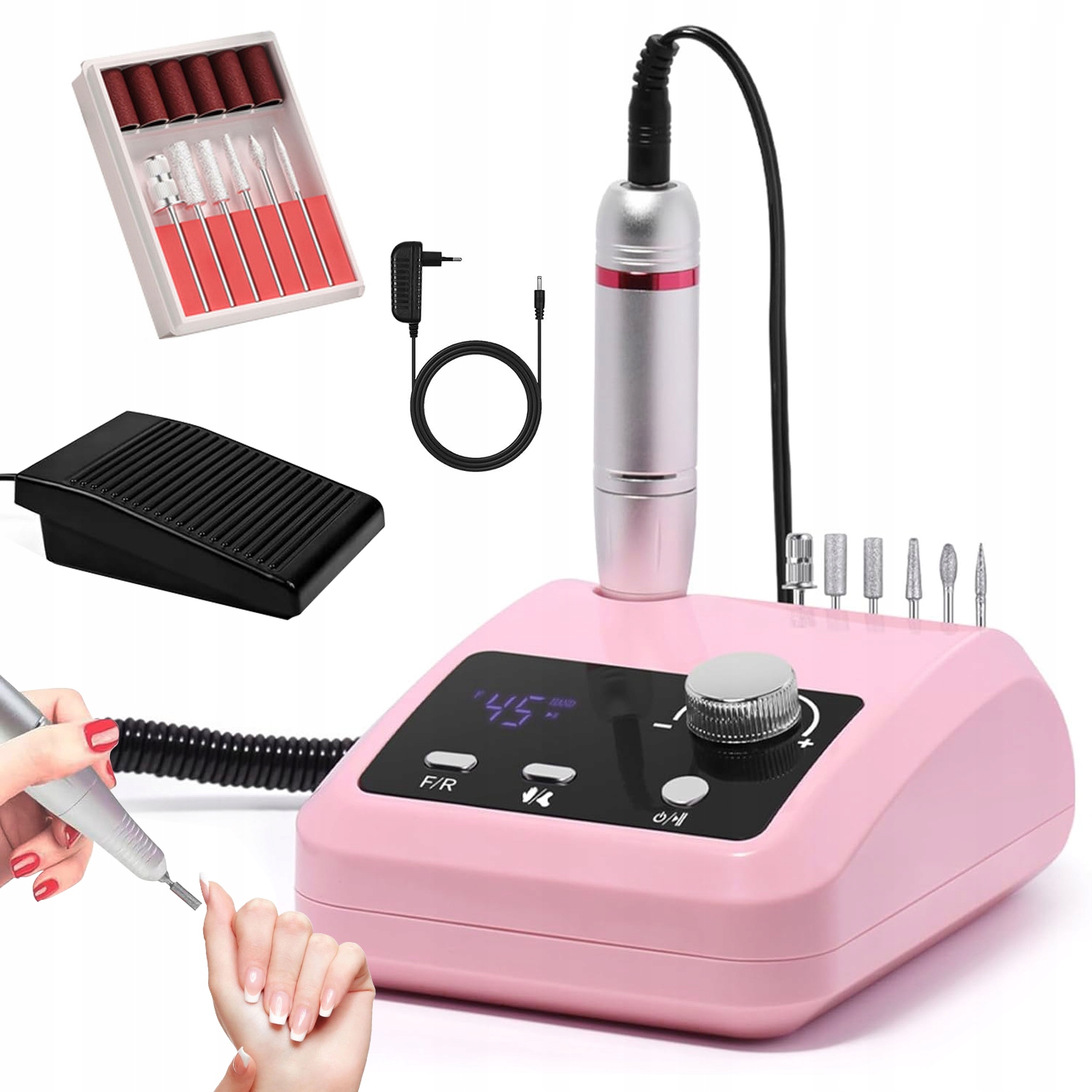 - Набір електричних пилок для нігтів має регульовану швидкість від 0 до 45000 об/хв. Ви можете плавно регулювати швидкість електричної пилки за допомогою ручки. Ви можете запустити або зупинити пилку в будь-який час під час підпилювання нігтів за допомогою ножної педалі. Висока швидкість обертання легко видаляє недоліки з поверхні нігтя, надаючи їм сліпучого блиску.
