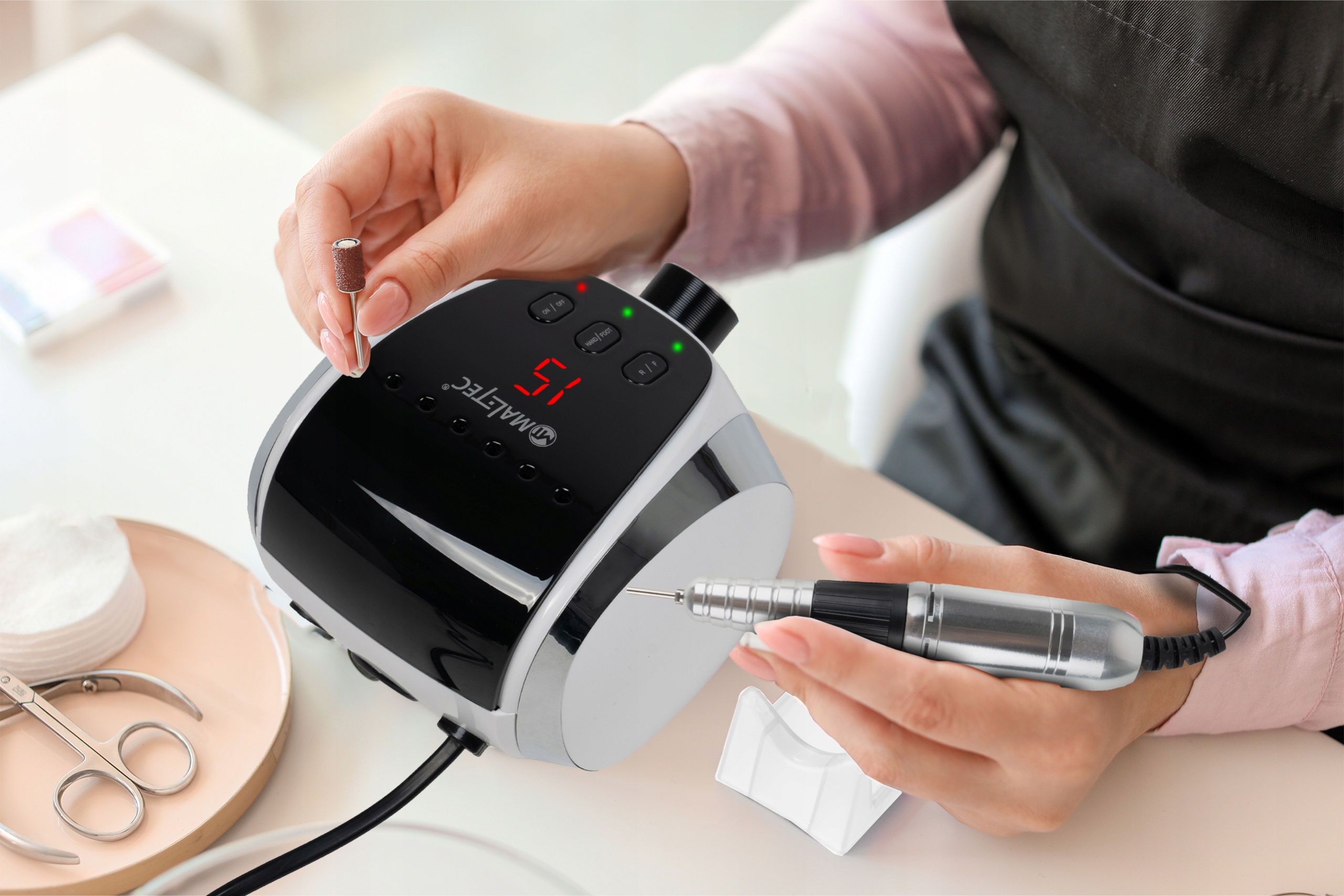 Фрезер підходить як для професійного використання в салоні краси, так і для домашнього використання. Завдяки використанню фрезера час виконання манікюру/педикюру скорочується майже вдвічі! Ваша нігтьова пластина не буде ослаблена використанням ацетону або надмірним пилком.