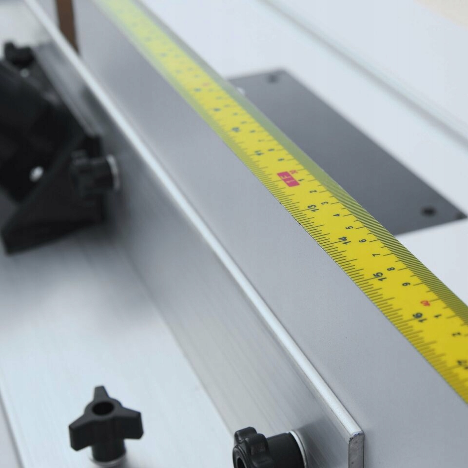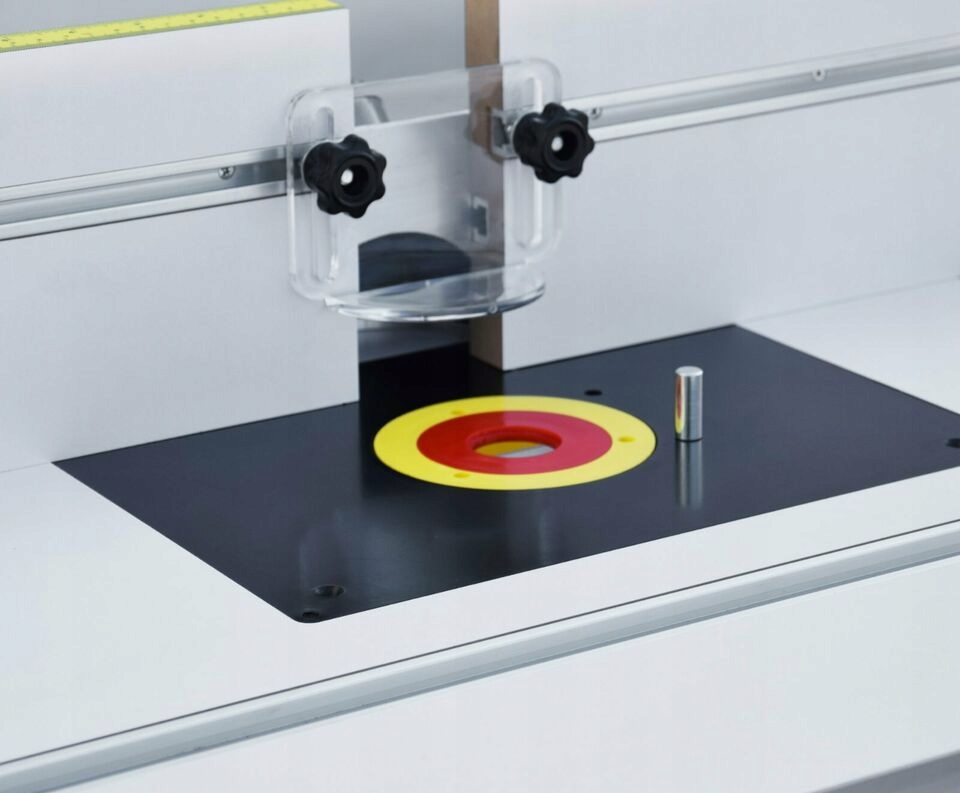 Стільниця з Т-подібним пазом (19 мм) ) для кріплення різних затискних пристроїв або упорів і регульованих упорів для фрезерування МДФ з мірною шкалою і Т-подібним пазом (8 мм) Фрезер встановлюється внизу столу в універсальну монтажну пластину. Ви повинні просвердлити монтажні отвори самостійно, залежно від типу та розміру фрезерного верстата.