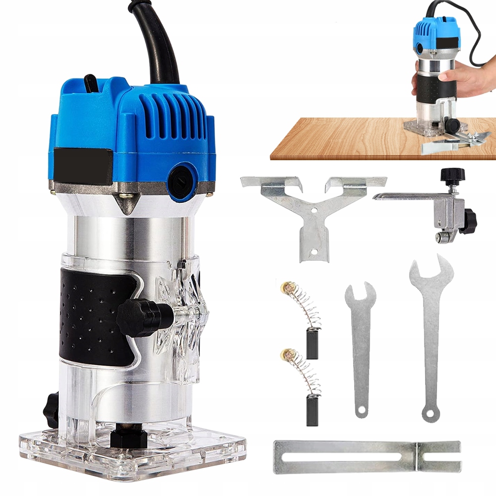 - Набір включає лінійні напрямні фрезера, напрямні для обрізання, ключі, напрямні шаблонів, регульовані кнопки, кнопки швидкого перемикання та інші аксесуари.