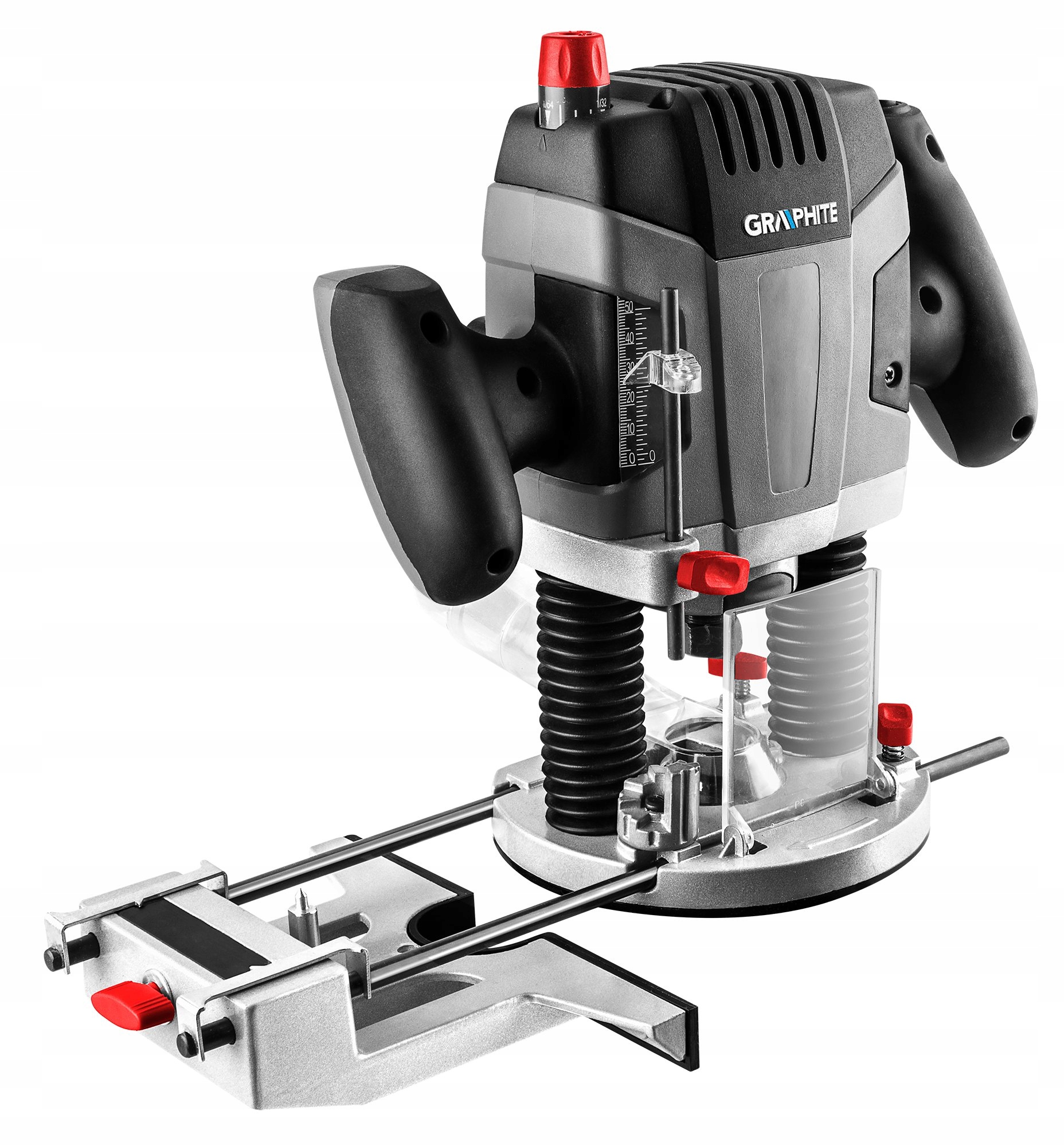 Фрезер GRAPHITE з ефективним двигуном потужністю 1300 Вт призначений для фрезерування отворів, пазів, країв і профілів у всіх типах дерев’яних і дерев’яних матеріалів, а також у пластмасі й алюмінії. Пристрій має функцію плавного регулювання швидкості і глибини фрезерування. Діапазон холостого ходу від 11 000 до 28 000 хв-1. Фрезерний верстат має блокування шпинделя і блокування глибини фрезерування. Глибину фрезерування можна регулювати за допомогою трьох пристроїв: 8-ступінчастого обмежувача глибини, обмежувача глибини з плавним налаштуванням (діапазон 0-55 мм) і ручки для точного регулювання глибини (точність 0,1 мм). Пристрій оснащений стійкою алюмінієвою ніжкою з пластиковою кришкою, що забезпечує легке наведення пристрою на будь-яких поверхнях. Направляючі двигуна фрезера вбудовані в алюмінієвий корпус з гніздами, які піддані спеціальній обробці поверхні, завдяки чому пристрій характеризується підвищеною точністю при опусканні. Ергономічні ручки фрезерного верстата покриті антиковзким матеріалом, що робить управління пристроєм комфортним і безпечним. Пилозахисний чохол і адаптер пиловідведення виготовлені з прозорого полікарбонату. Фрезерний верстат оснащений великою ручкою регулювання швидкості, яка розташована в межах досяжності великого пальця правої руки оператора. Поряд з лівою рукояткою фрезерного верстата розташований дугоподібний ергономічний важіль фіксатора направляючої корпусу, що дозволяє керувати ним, не відриваючи руки. У комплекті з фрезером є: ключ ріжковий, направляюча втулка для копіювання за шаблоном, вістря для фрезерування по колу, перехідник для відведення пилу з редукцією, три затискні втулки діаметрами 6, 8, 12 мм, алюмінієва паралельна напрямна, оснащена спеціальною кришкою з матеріалу, що захищає від подряпин, і механізмом, що дозволяє точно регулювати положення фрези щодо краю матеріалу.