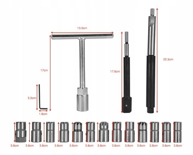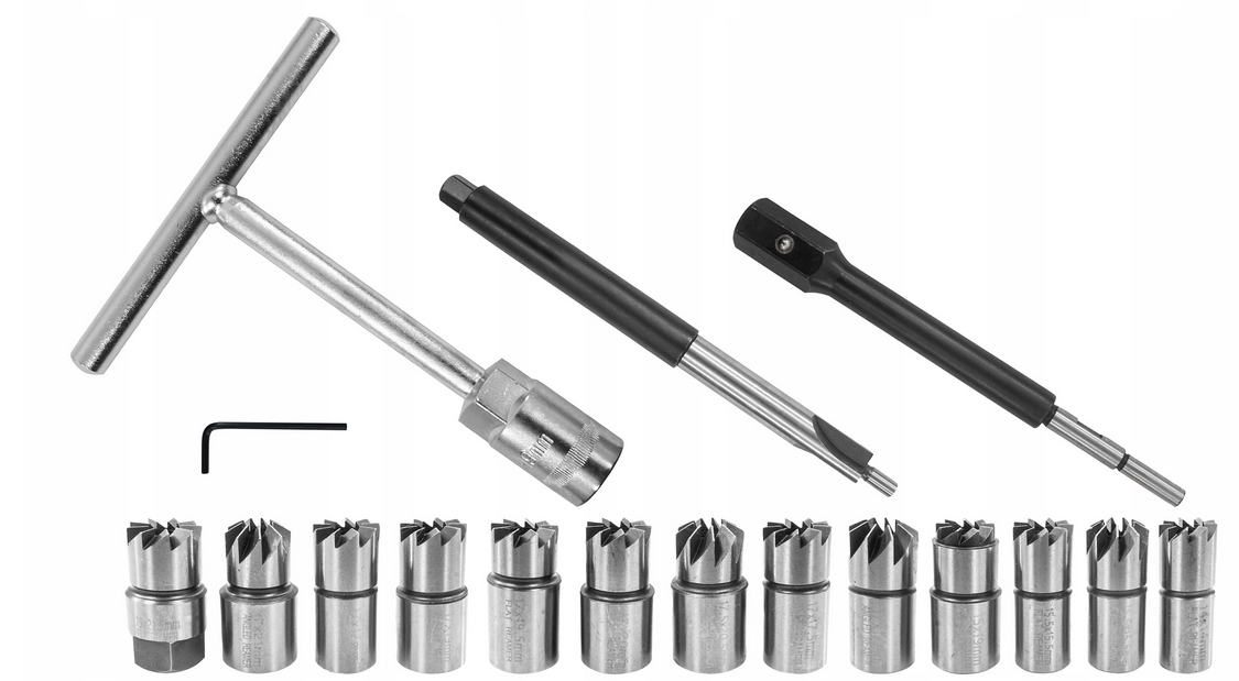 Набір VERKE містить 17 елементів, адаптованих до різних діаметрів і типів гнізд інжектора, включаючи плоскі та кутові фрези, ніж, Т-подібну ручку та пульт дистанційного керування.