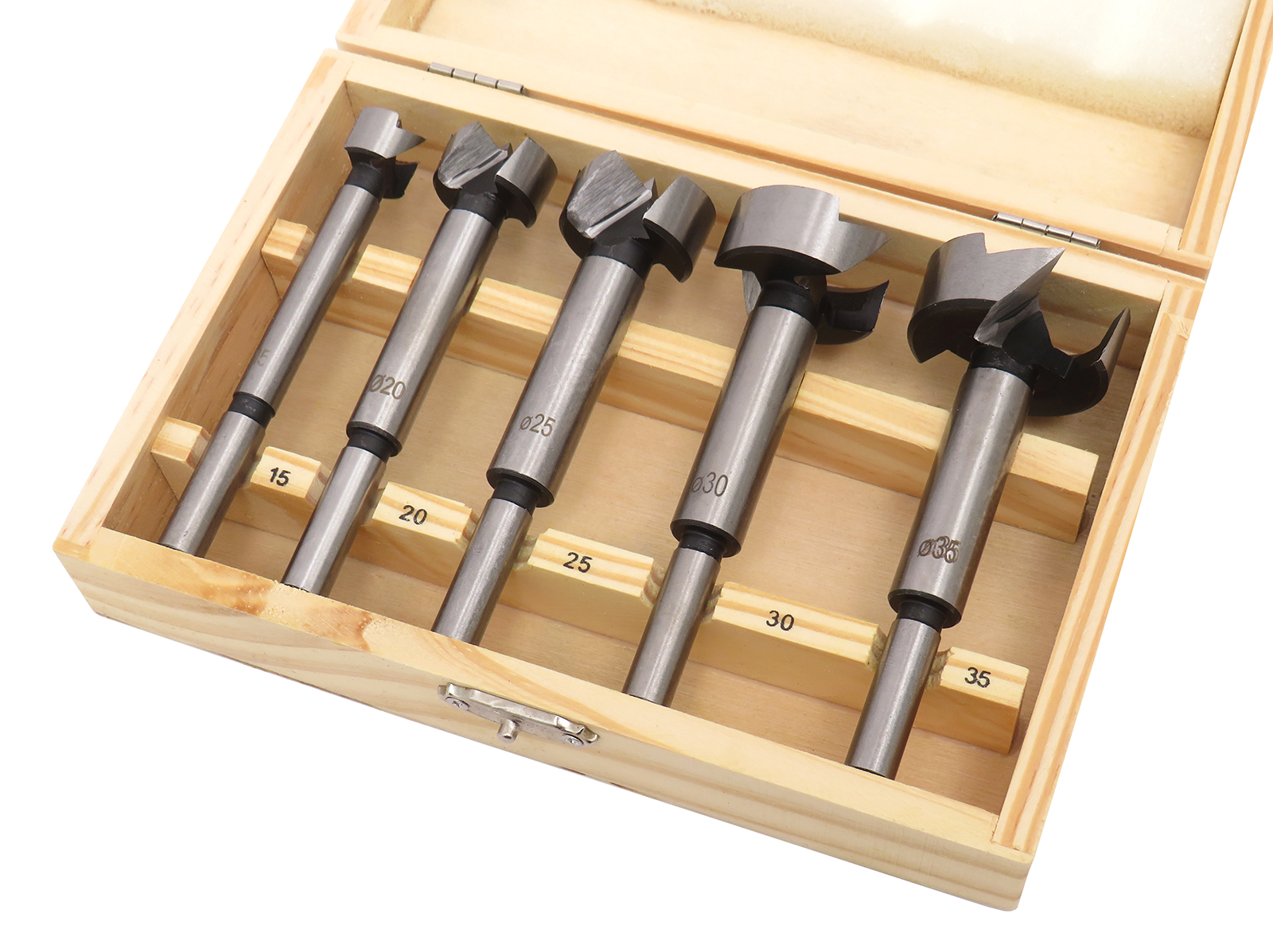 В набір входять фрези розміром: 15, 20, 25, 30, 35 мм. З їх допомогою можна легко просвердлити отвори в дошках, меблевих щитах та інших матеріалах, схожих на деревину.