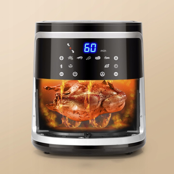 Фритюрниця має 7 попередньо запрограмованих рецептів: картопля, креветки, курка, яловичина, м’ясо, риба, тістечка та збереження тепла. Керувати ним дуже просто, просто виберіть функцію, яку ви хочете використати, або, якщо хочете, внесіть налаштування вручну. Можливість встановити температуру в діапазоні 80-200ºC і час 0-60 хв.