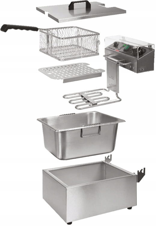 Нагрівачем 3,0 кВт керує потенціометр, розташований на панелі керування. Можна встановити робочу температуру в діапазоні 60~200?. Встановлений захищений від бризок вимикач дозволяє вимкнути пристрій, не від'єднуючи кабель живлення від мережі. Крім того, панель управління має захисну кришку з дуже міцного полікарбонату, яка захищає панель від бризок олії під час смаження. Це значно полегшує утримання фритюрниці в чистоті. Знімний обігрівач можна повісити на спеціальний тримач у такому положенні, де масло, що капає, повертається в резервуар. Фритюрниця має додаткову функцію безпеки, яка автоматично вимикає нагрівач, коли вона виймається з бака. Додатковий захист захищає його від перегріву при температурах вище 260?.