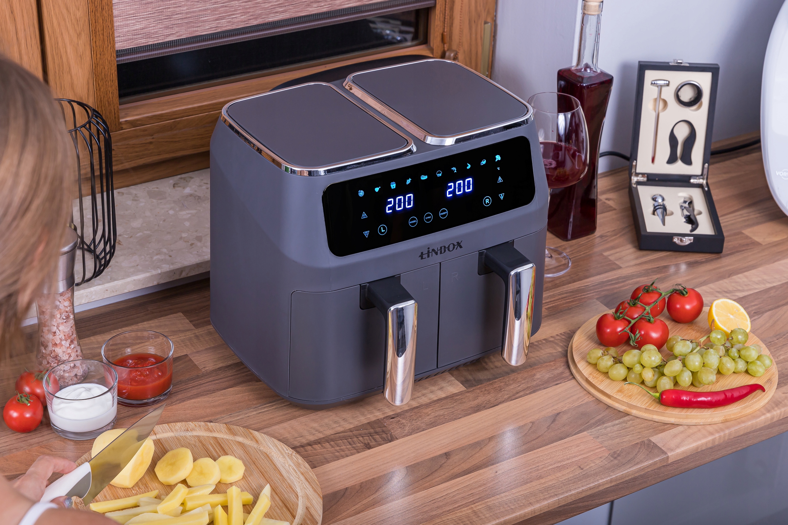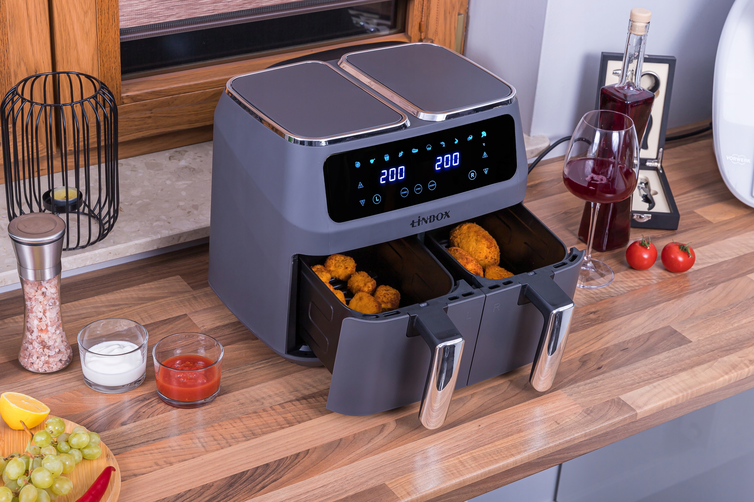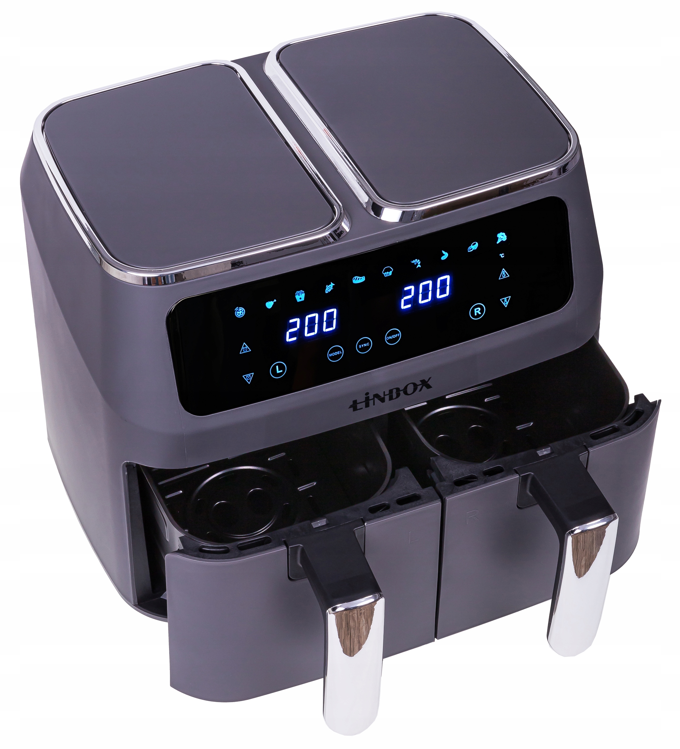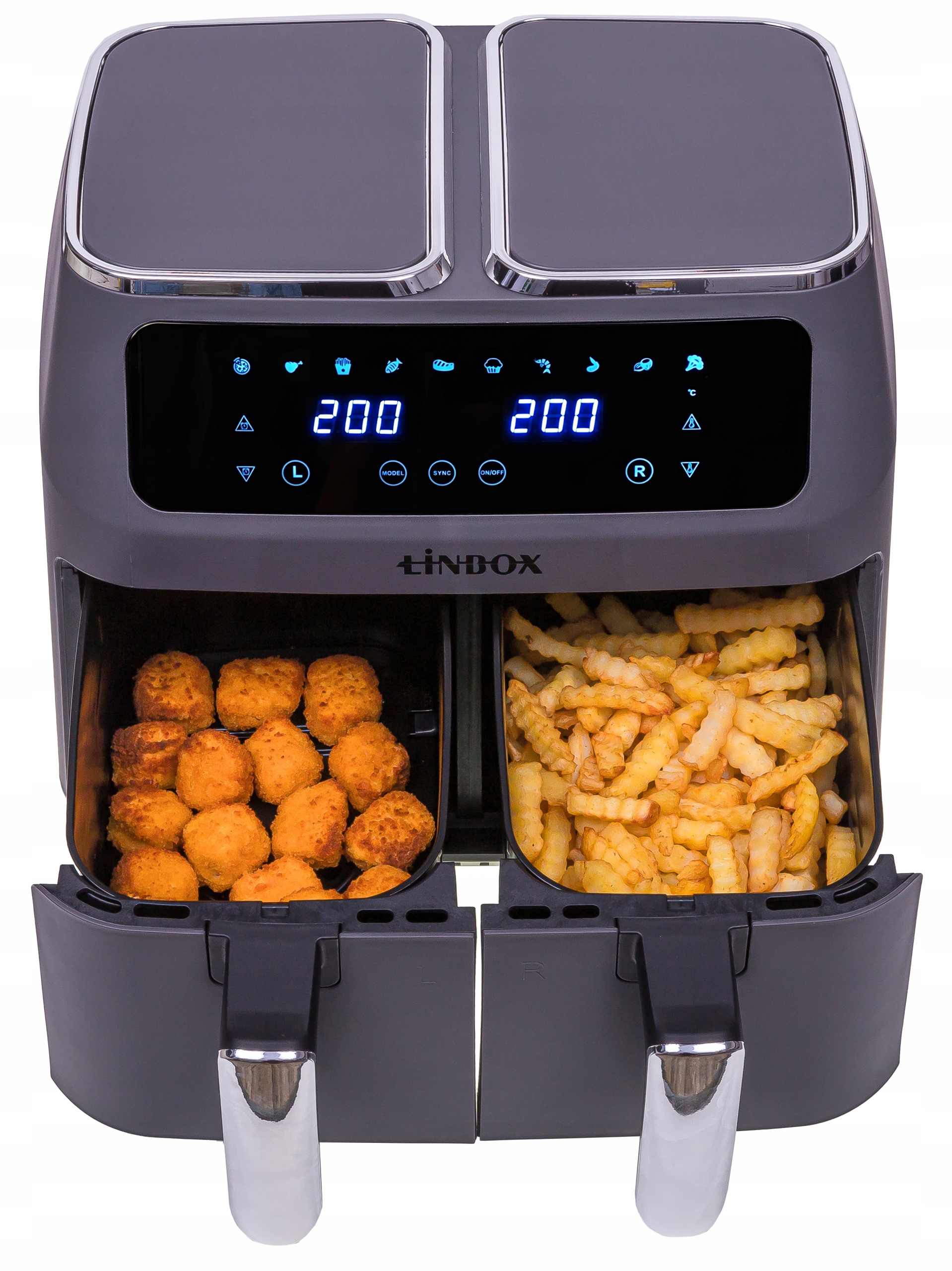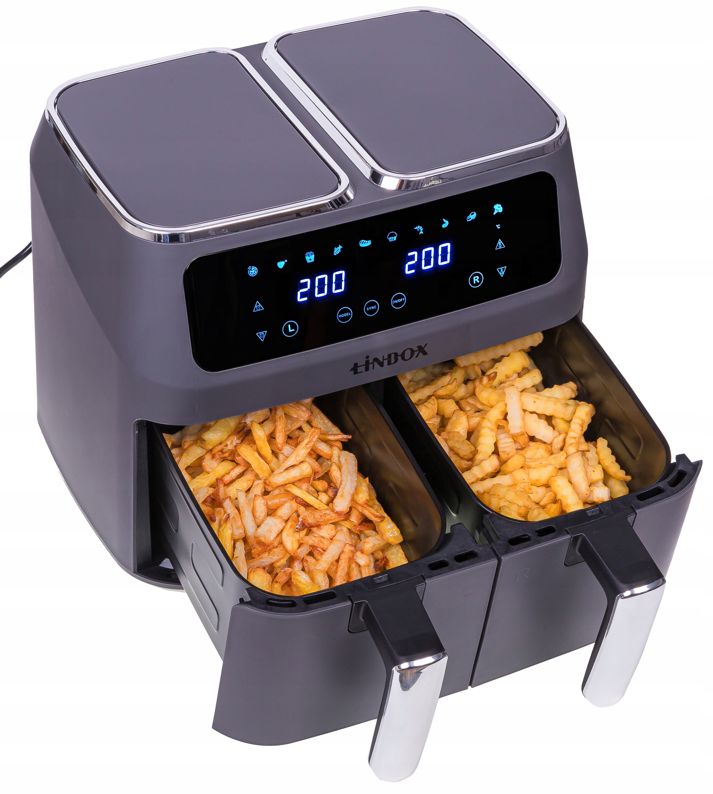Фритюрниця має 2 незалежні кошики. Завдяки цьому ми можемо готувати 2 різних продукти одночасно. Наприклад, один тримає картоплю фрі, а інший тримає крила або гомілки.