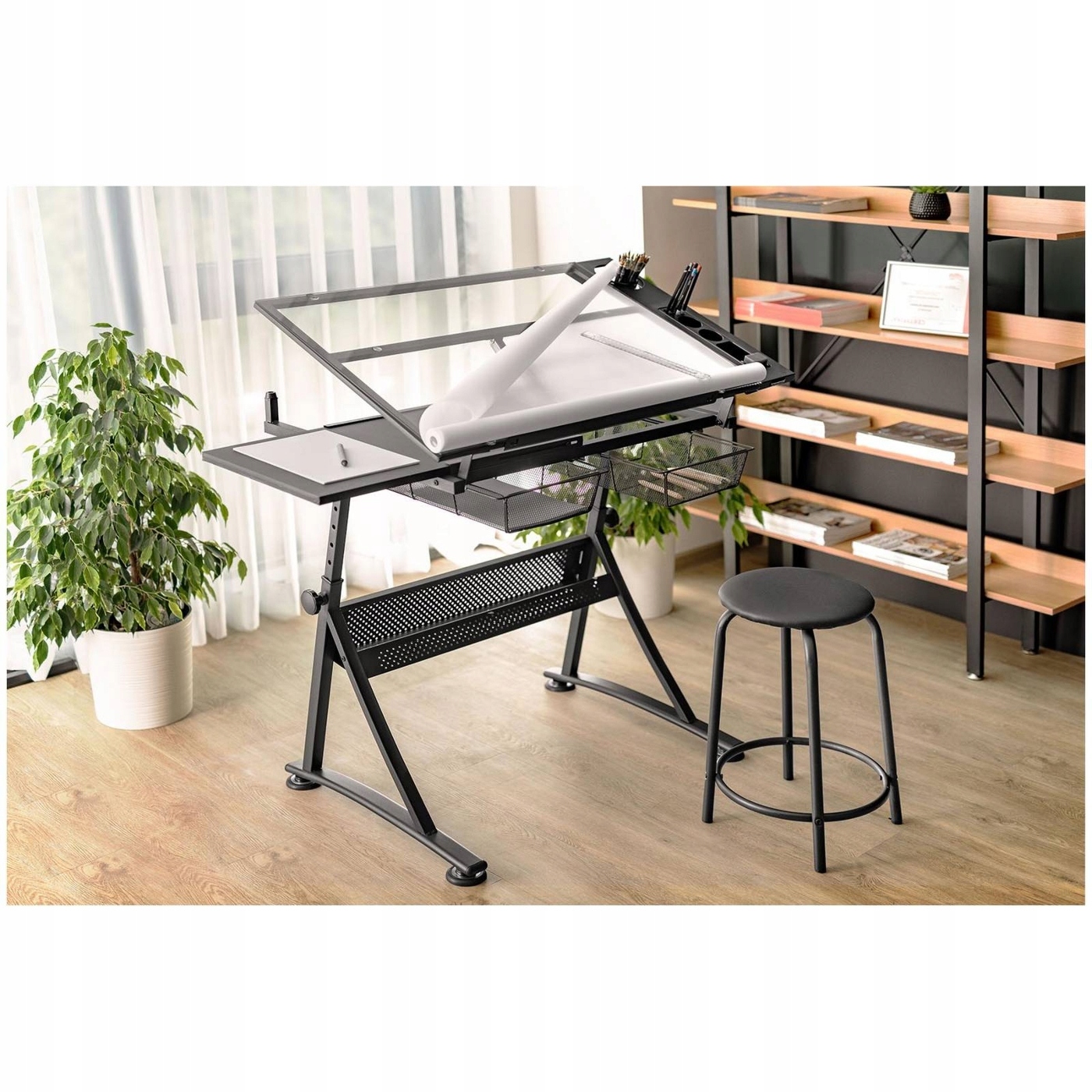 Велика робоча поверхня змушує вас без проблем розбити цілі аркуші паперу. Розміри меблів (120 х 60 см) та висота 90 см дозволяють користувачеві вільно працювати. Крім того, головний верх можна встановити під кутом до 70 °. Стіл малювання також має два ємності ящиків, коробку для інструментів та металеву полицю.