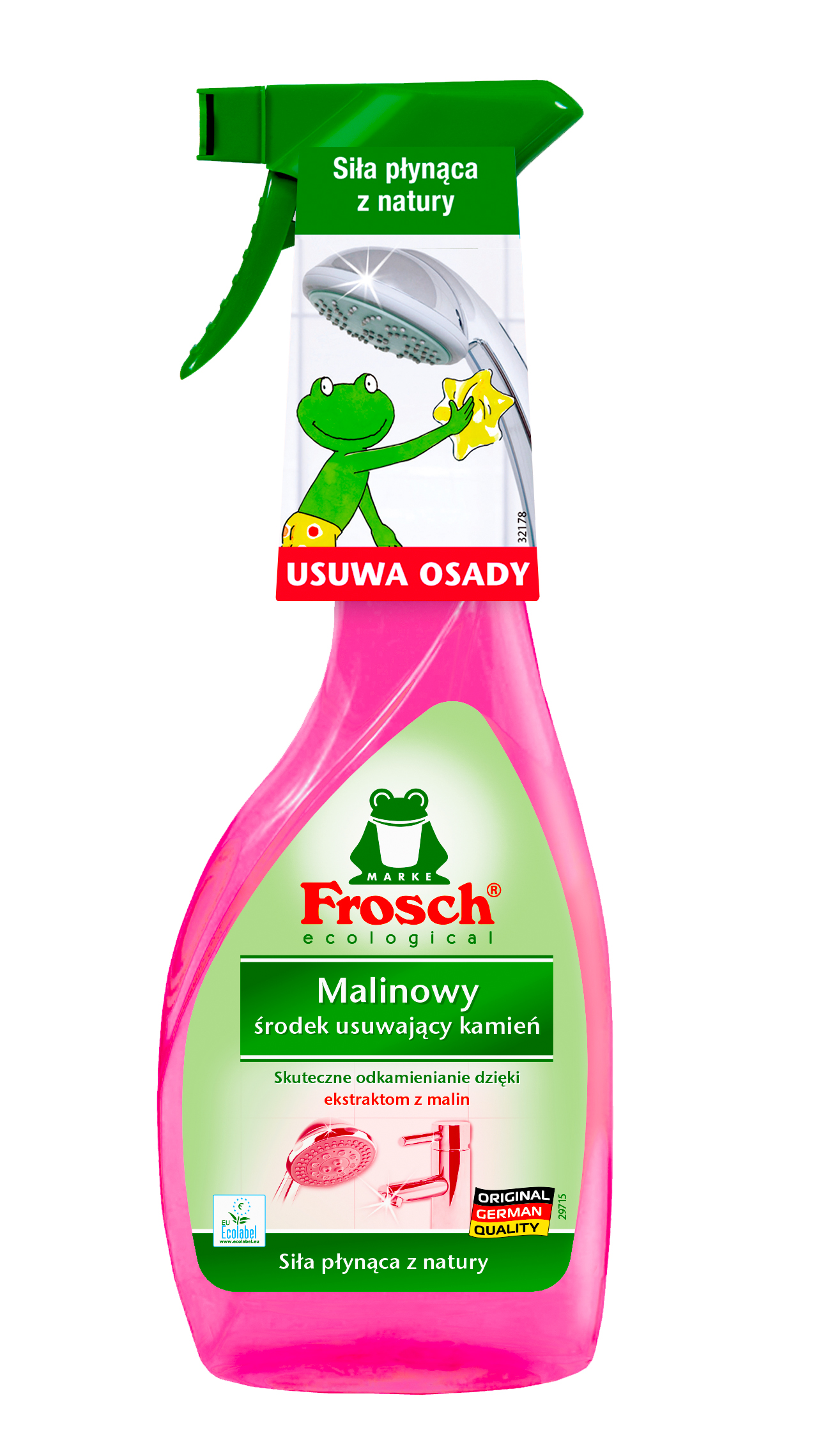 Малиновий спрей Frosch для видалення накипу з кухонної та ванної техніки. Містить висококонцентровану формулу на основі натурального малинового оцту.