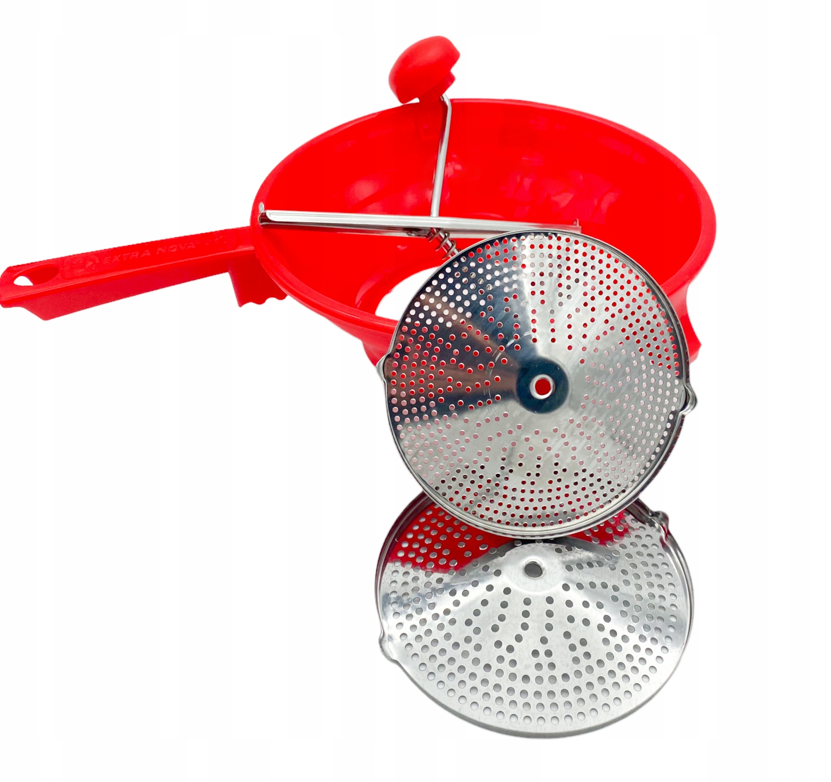Овочеве та фруктове пюре з високоякісного пластику. Ситечко і лопатка виготовлені з нержавіючої сталі. Має два змінних сітчастих фільтра з різними діаметрами вічок. Продукт на 100% безпечний і призначений для контакту з харчовими продуктами. Матеріал робить його легким, що робить використання склоочисника легким і комфортним. Ручка з отвором для підвішування надійно лягає в руку і зручна. Легко підтримувати в чистоті - знімні елементи.