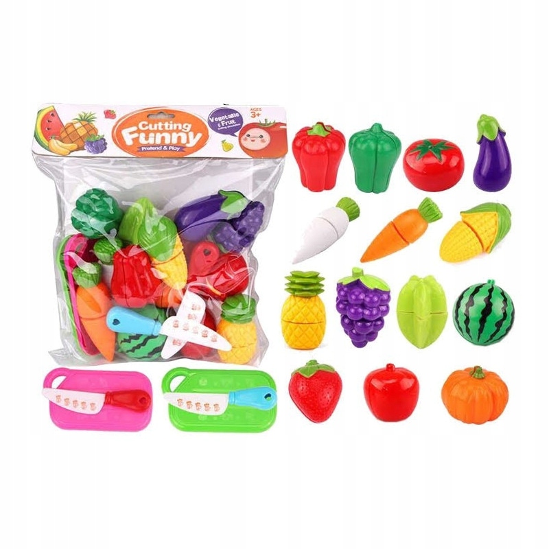 Набір складається з 18 елементів: морква, 2x перець, помідор, баклажан, петрушка, кукурудза, ананас, виноград, карамбола, кавун, полуниця, яблуко, гарбуз, 2x обробна дошка, 2x ніж . Фрукти та овочі можна «розрізати» ножем, що входить до комплекту, потім їх легко з’єднати за допомогою липучки всередині.