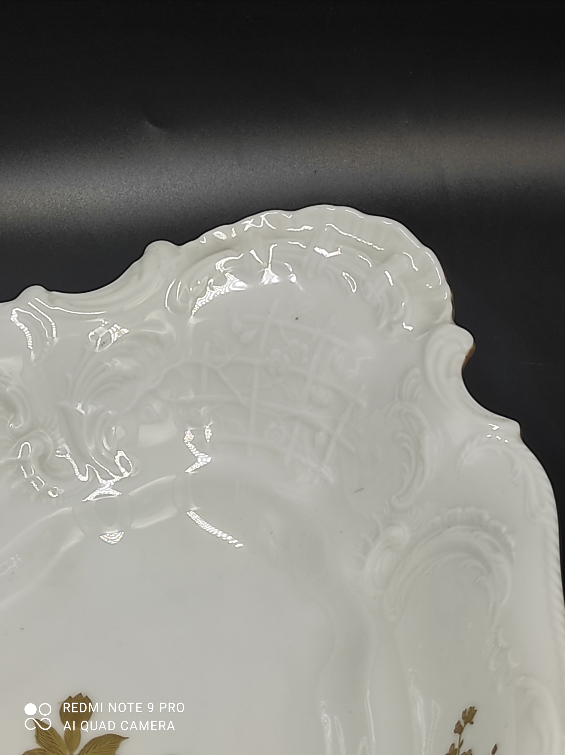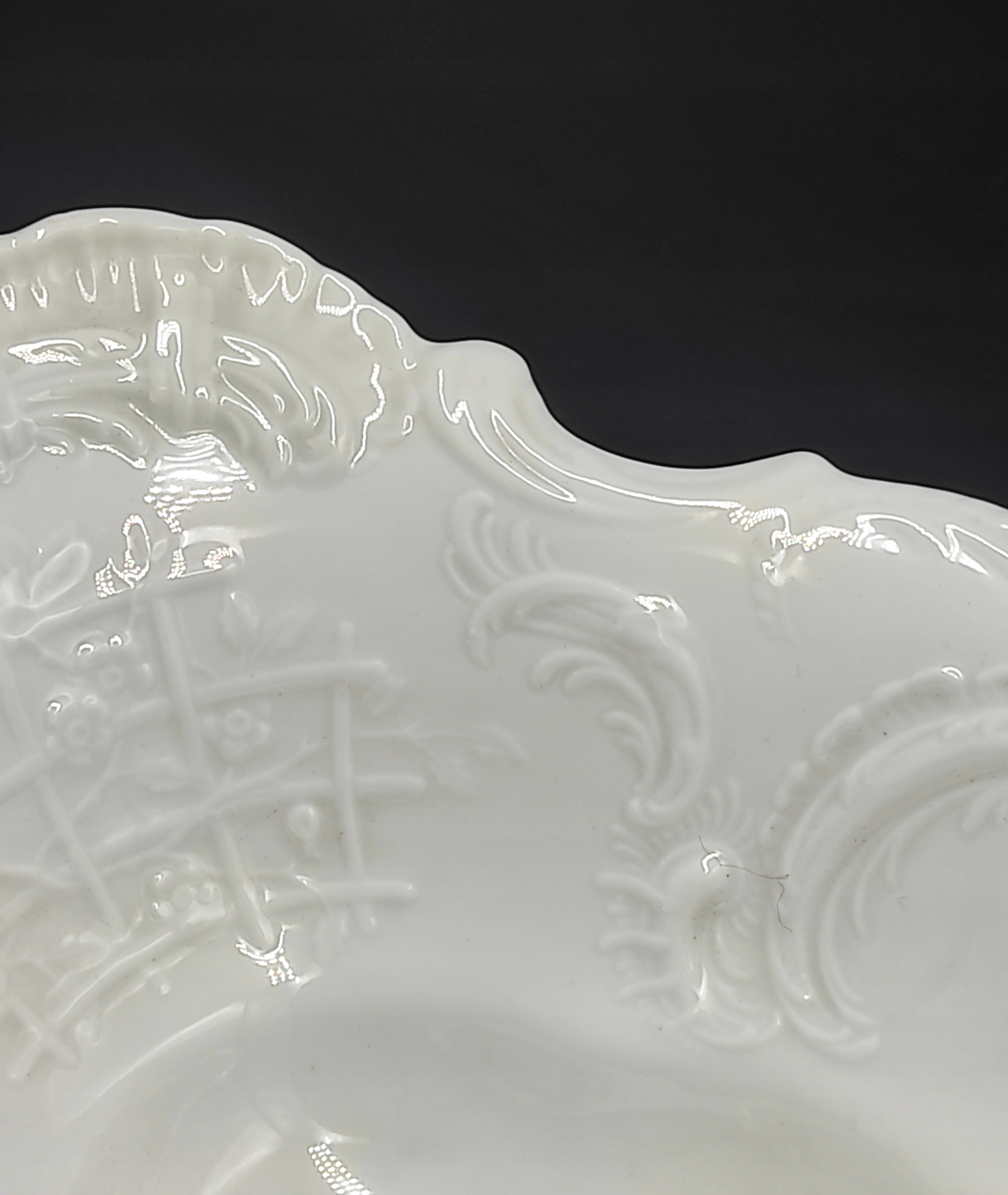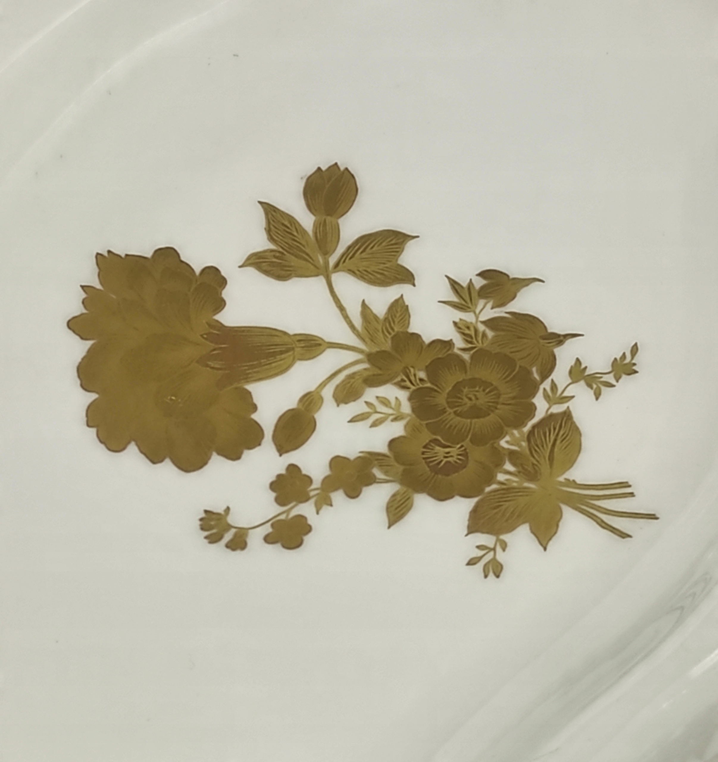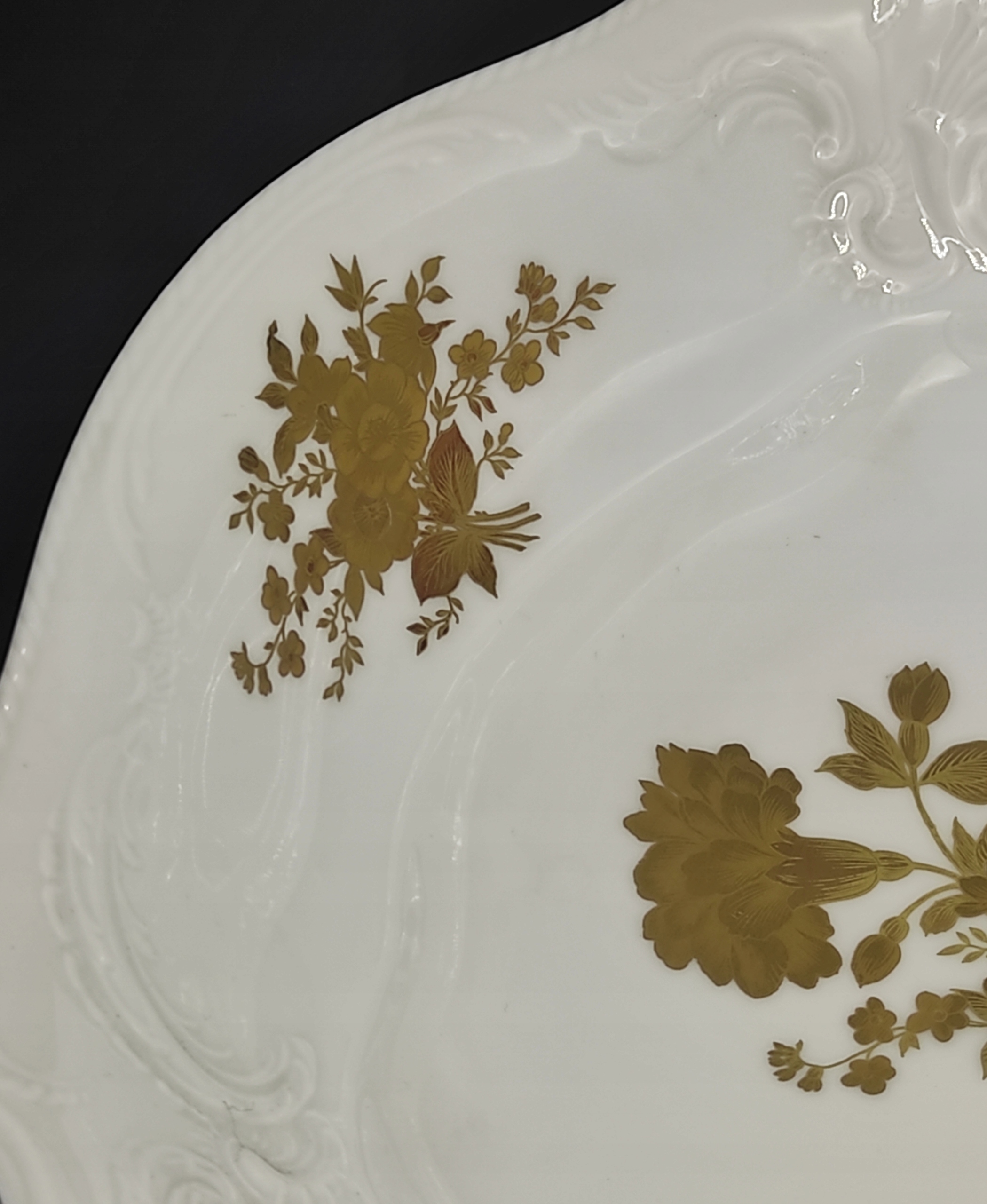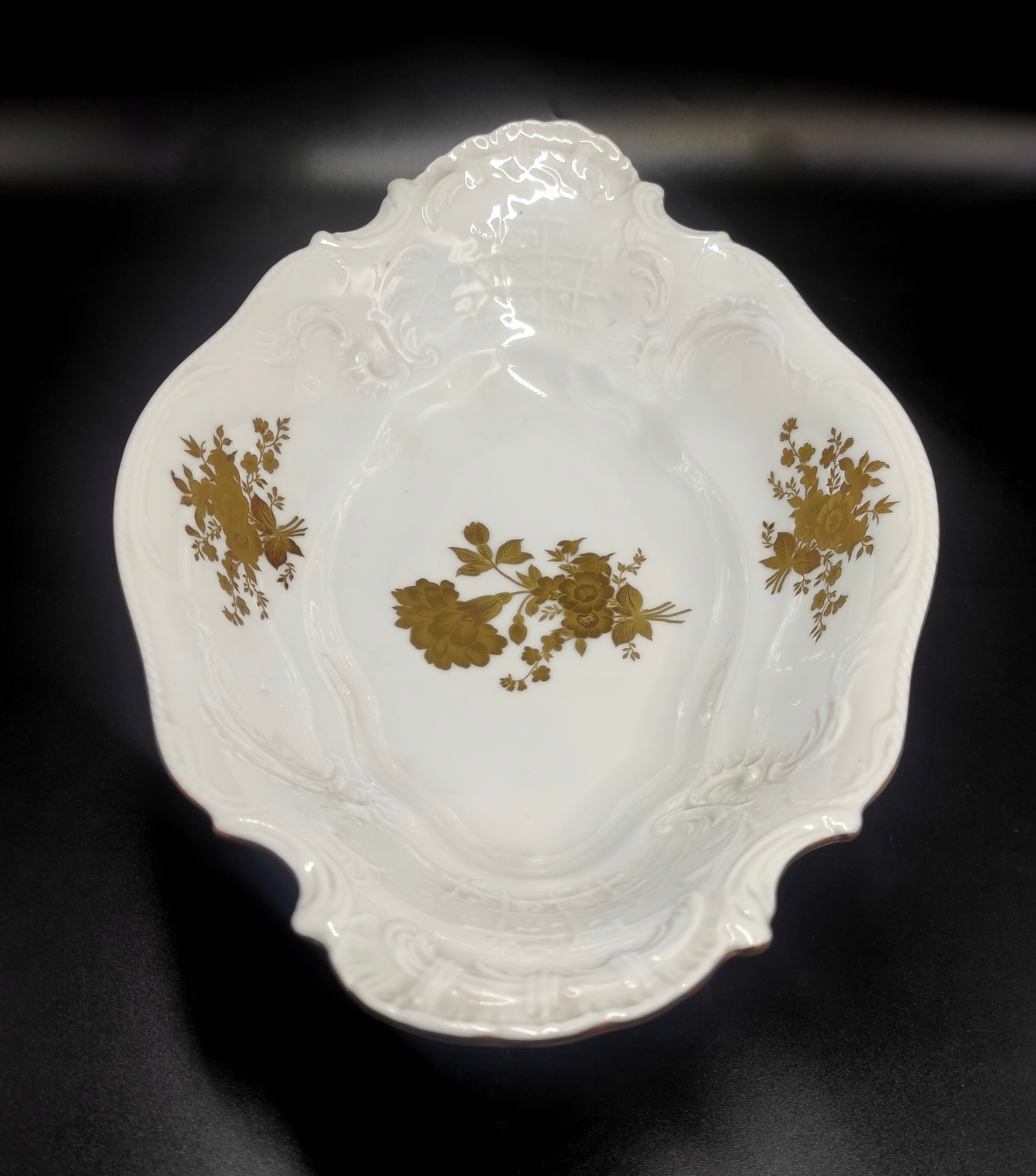 Виготовлено з білої порцеляни найвищої якості. Його форма зачаровує! Встановлений на низьку цікаво профільовану основу, розкльошені краї, прикрашені характерним для моделі SANSSOUCI рельєфом. Всередині красиві золотисті рослинні мотиви - в центрі та з боків. Жардіньє підписане внизу.