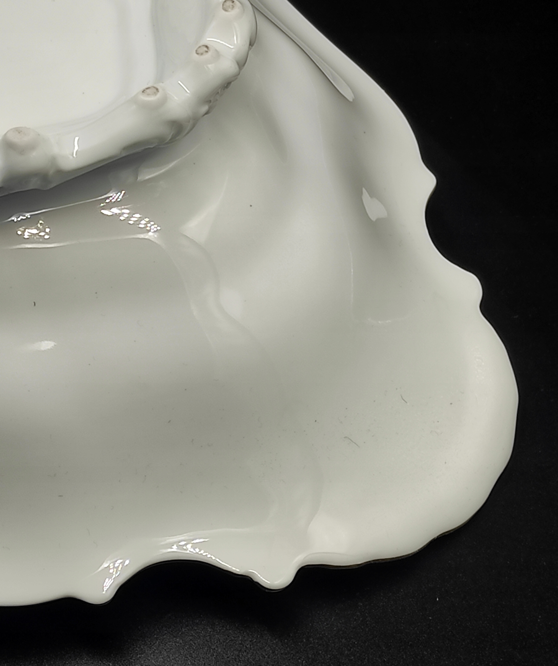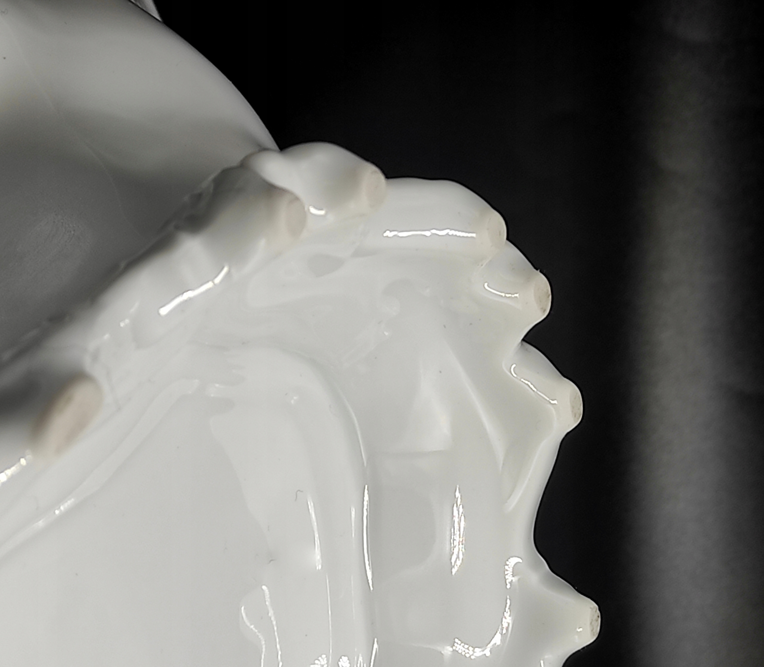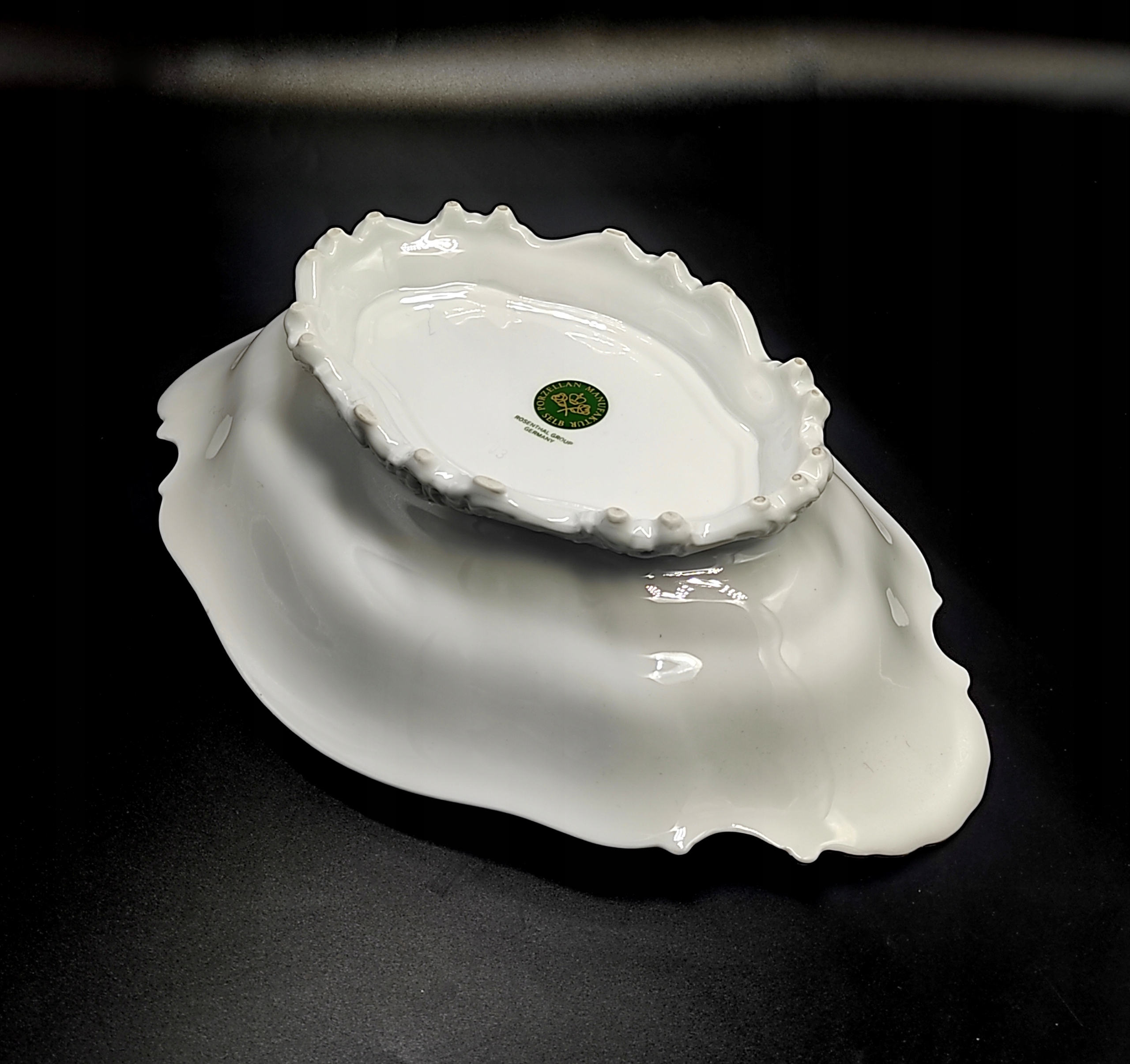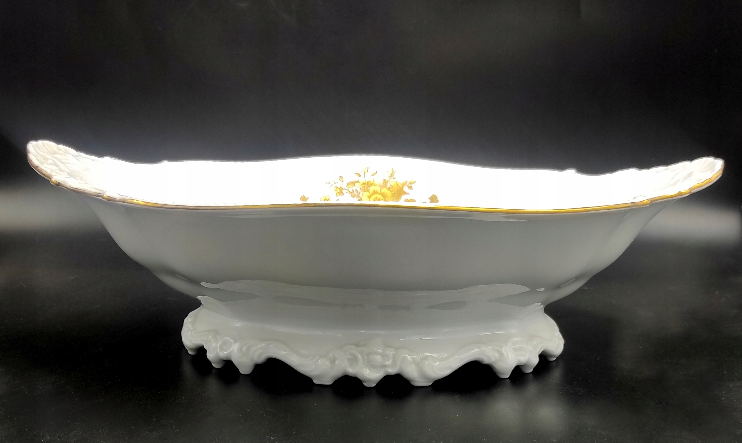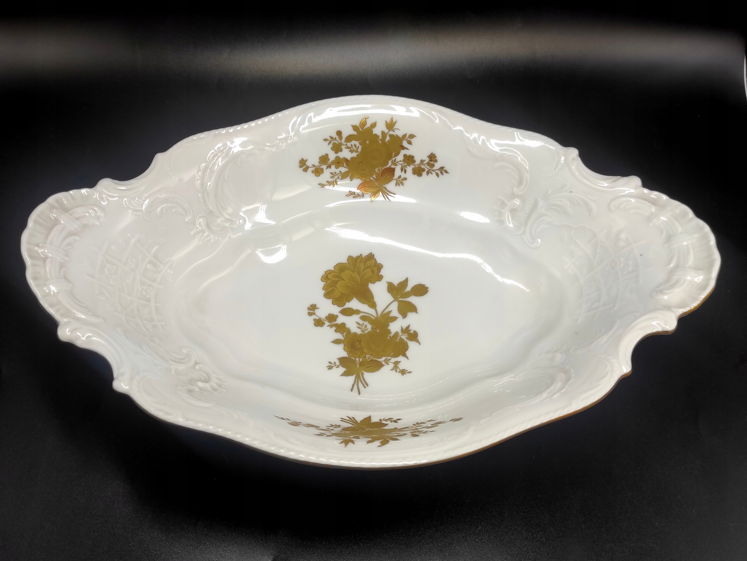 Виготовлено з білої порцеляни найвищої якості. Його форма зачаровує! Встановлений на низьку цікаво профільовану основу, розкльошені краї, прикрашені характерним для моделі SANSSOUCI рельєфом. Всередині красиві золотисті рослинні мотиви - в центрі та з боків. Жардіньє підписане внизу.