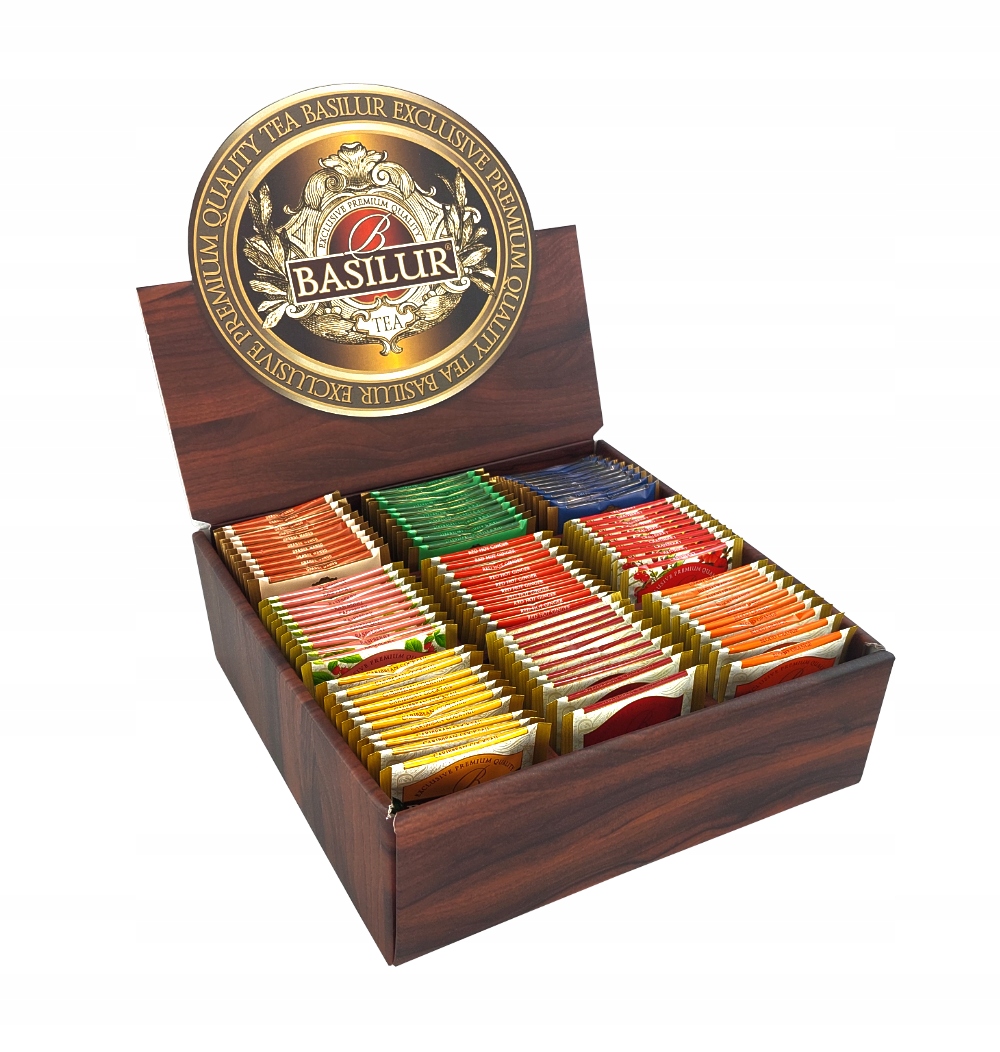 Ви заслуговуєте на щосьабсолютно унікальненаприклад, чайний набір Basilur у складній коробці, картонний дисплей із логотип бренду Basilur Tea для практичного зберігання чаю.