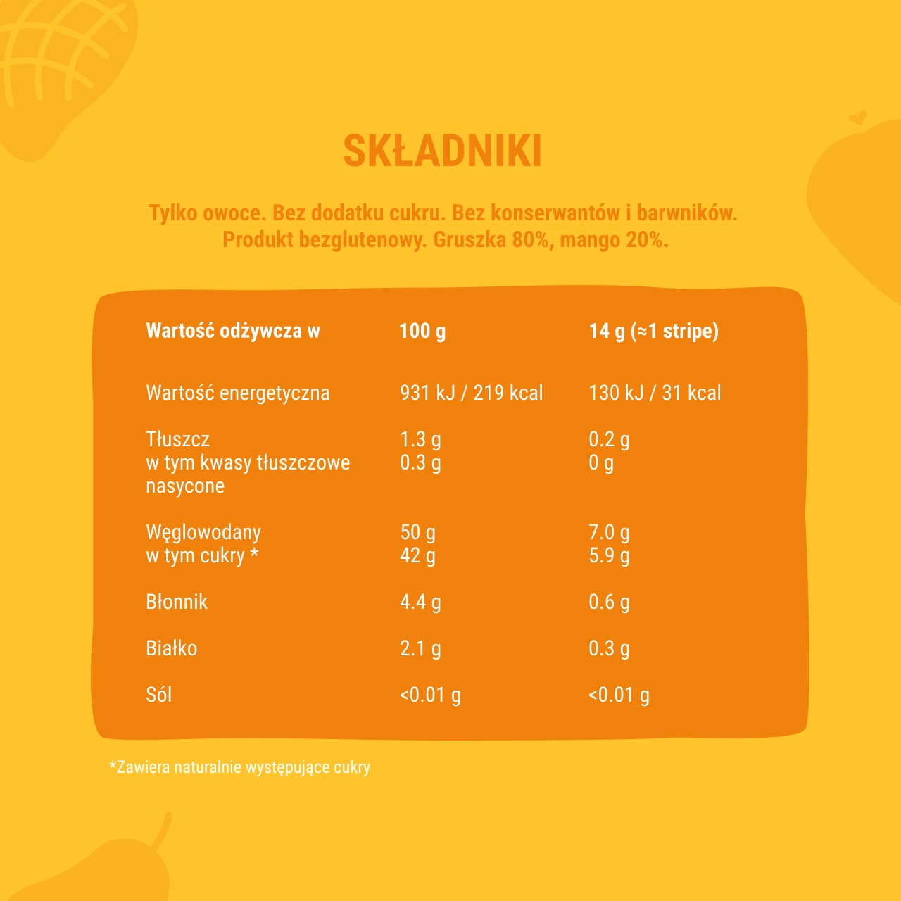- Чистий склад. Страйпи мають 100% натуральний склад. Це просто фрукти і нічого більше! Вони завжди виготовляються без додавання цукру, консервантів і барвників. Вони не містять глютену та ГМО.