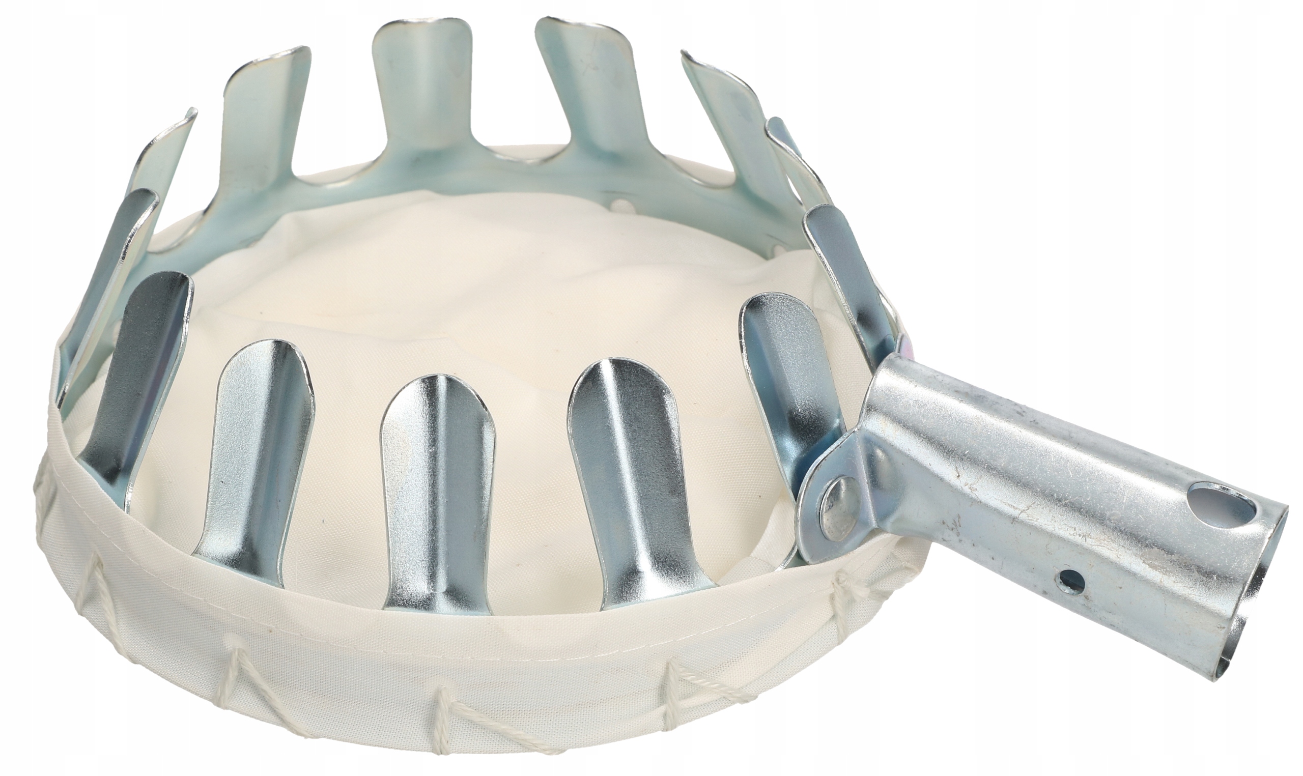 - Збирач фруктів складається з металевого кільця з тупими зубами, які дозволяють ефективно збирати фрукти з гілок.