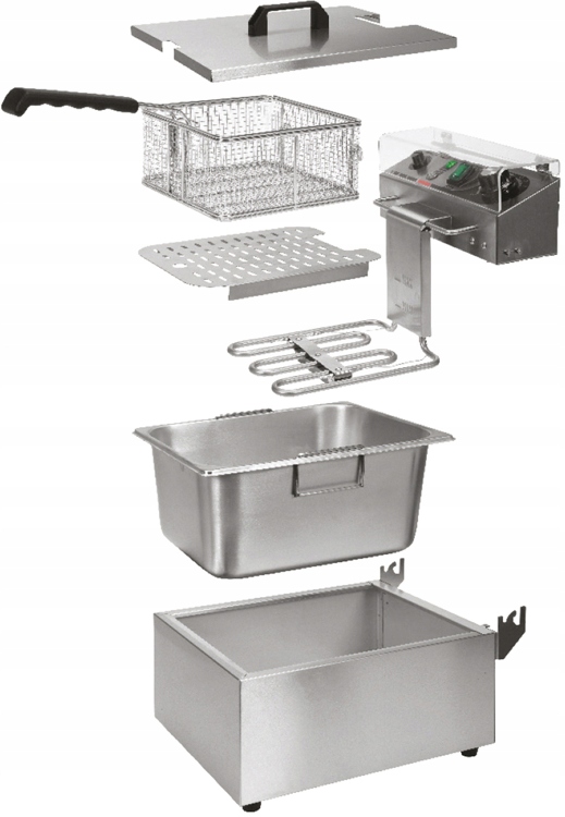 Фритюрник оснащений ефективним нагрівальним елементом потужністю 2 кВт та термостата з плавним регулюванням температури в діапазоні від 60 до 200 ° C . Панель управління також включає перемикач Brizgoszc, кнопку скидання та керуючі лампи, що інформують користувача про роботу нагрівального елемента.