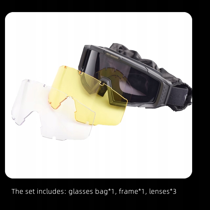 - Конфігурація з багатьма лінзами: Набір містить 3 пар лінз (чорні лінзи, прозорі лінзи, жовті лінзи), які можна замінити залежно від середовища та потреб.