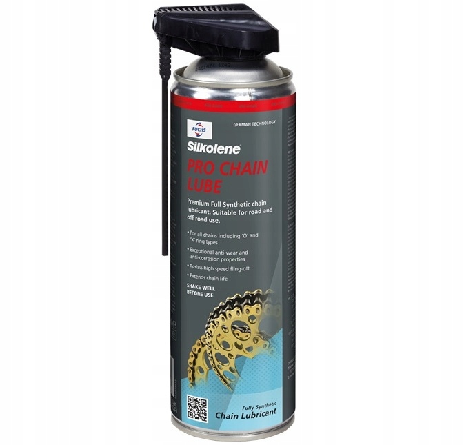 FUCHS SILKOLENE PRO CHAIN - це професійне, повністю синтетичне мастило для ланцюгів спортивних і гоночних мотоциклів. Завдяки використанню сучасної технології він створює тонкий, чистий і прозорий захисний шар, який міцно прилягає до поверхні ланцюга і не викидається відцентровою силою - навіть на дуже високих швидкостях.