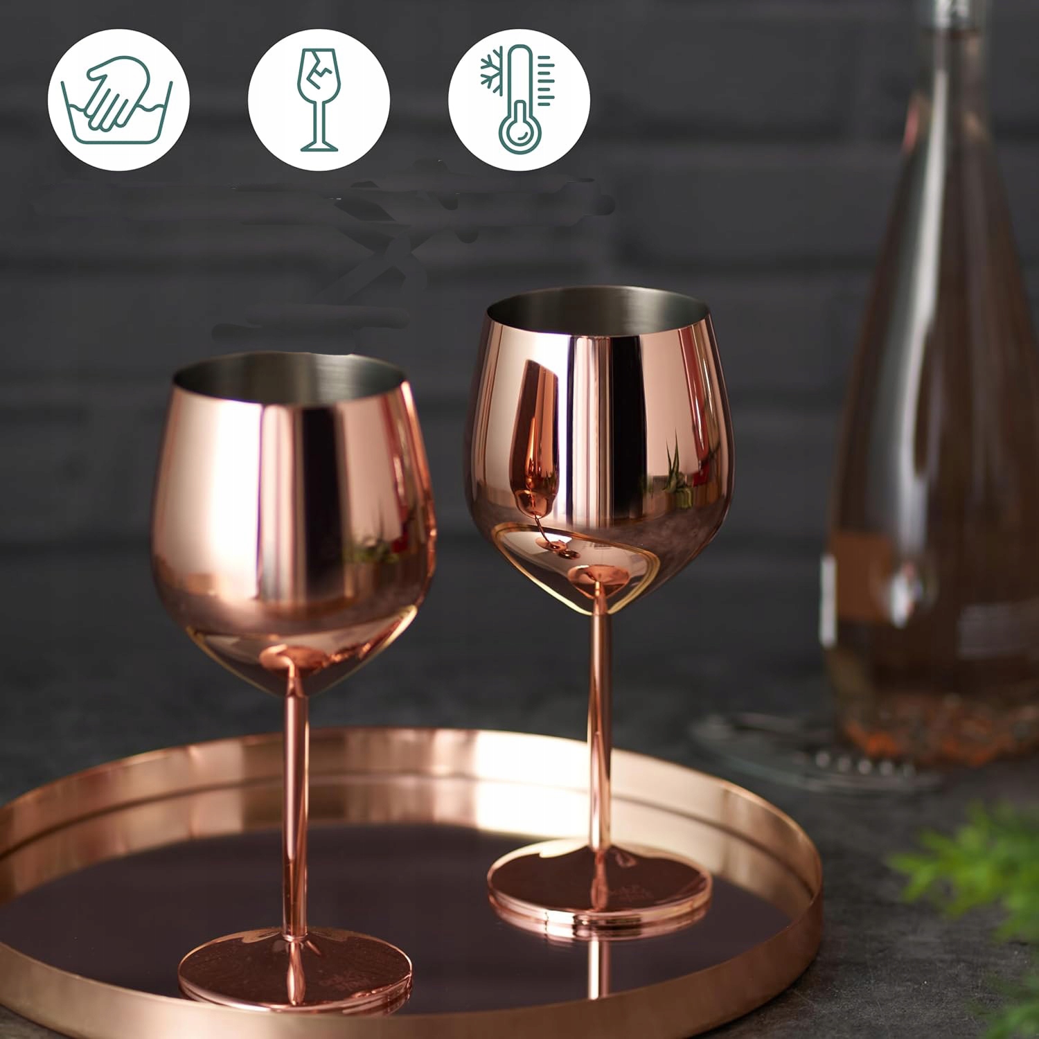 Ці золотисті келихи для вина виготовлені з високоякісної нержавіючої сталі 18/8, легші та міцніші, ніж скло або кришталь. Винні келихи з рожевого золота можна мити лише вручну. Просто вимийте теплою водою з милом і вуаля, як нові!