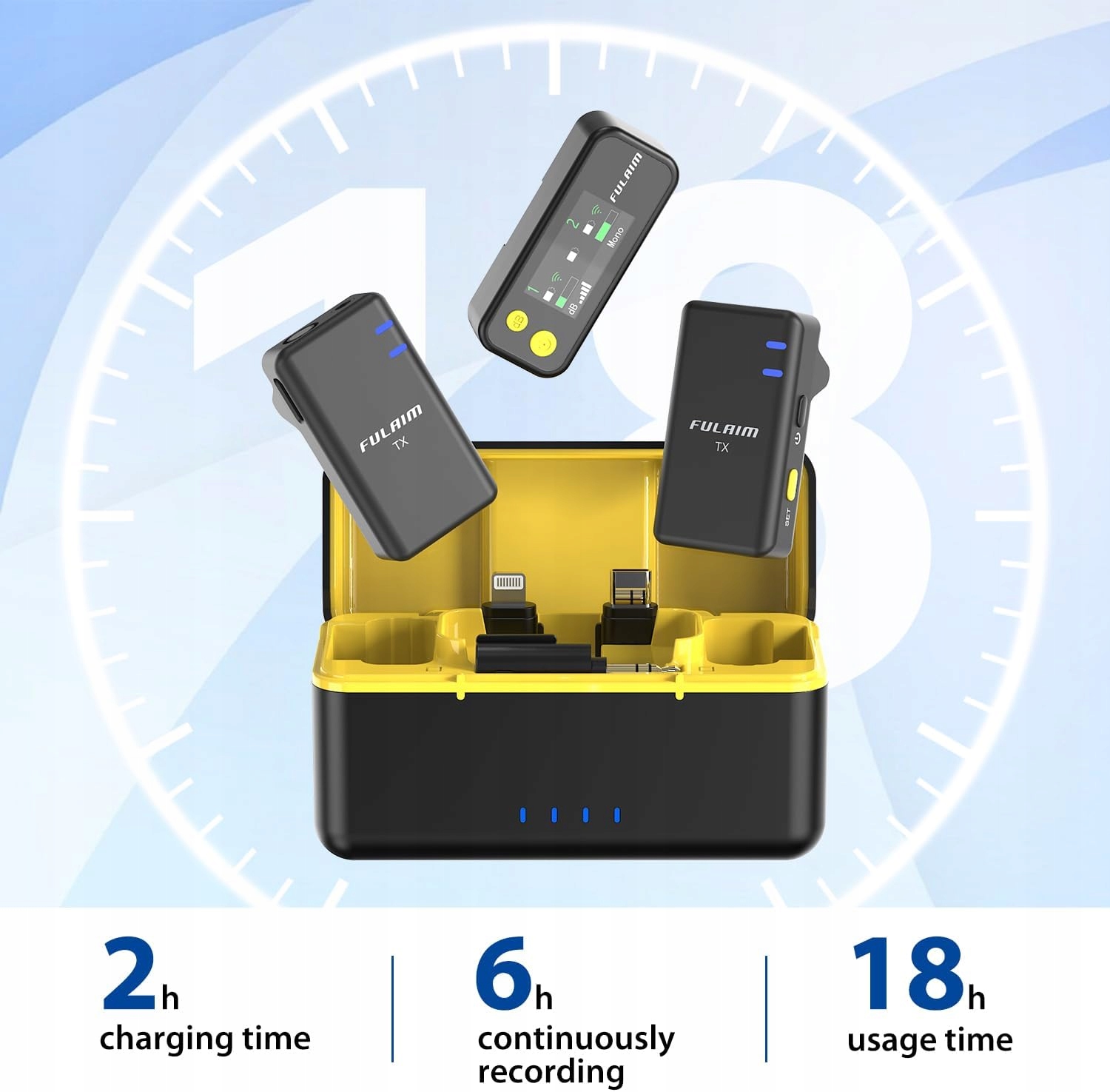 Зустріньте fulaim x5 - бездротовий мікрофон краватки (2 передавачі + 1 приймач + корпус зарядки) , який забезпечує професійну якість звуку у ваших записах - ідеально підходить для створення вмісту на youtube, проросте, vlog або живої передачі . Сумісний з пристроями iPhone, iPad, Samsung та Android (з відповідним адаптером USB-C-C до 3,5 мм у наборі) пропонує діапазон до 200 м та до 18 годин роботи акумулятора .