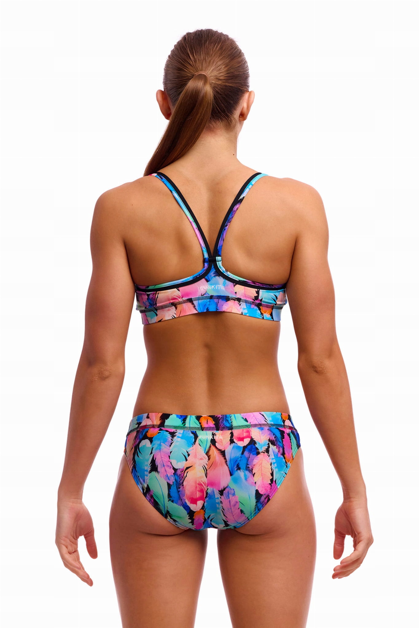 Спортивний топ бікіні Funkita має приталену спинку, міцні плоскі та еластичні лямки та широку еластичну стрічку під грудьми для посилення підтримки в цій частині тіла.