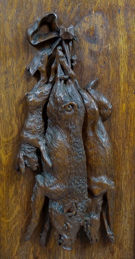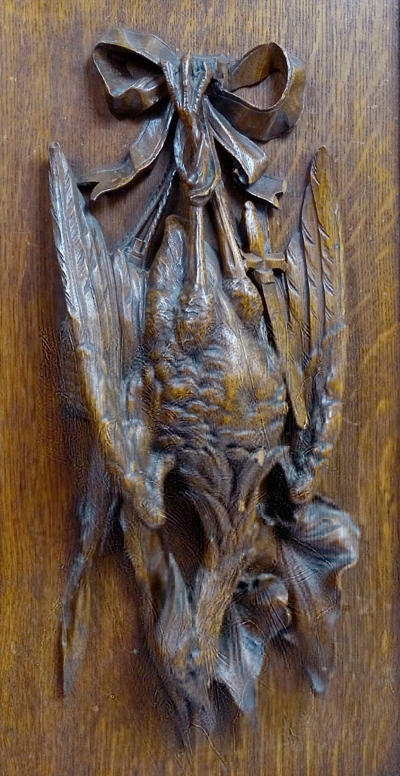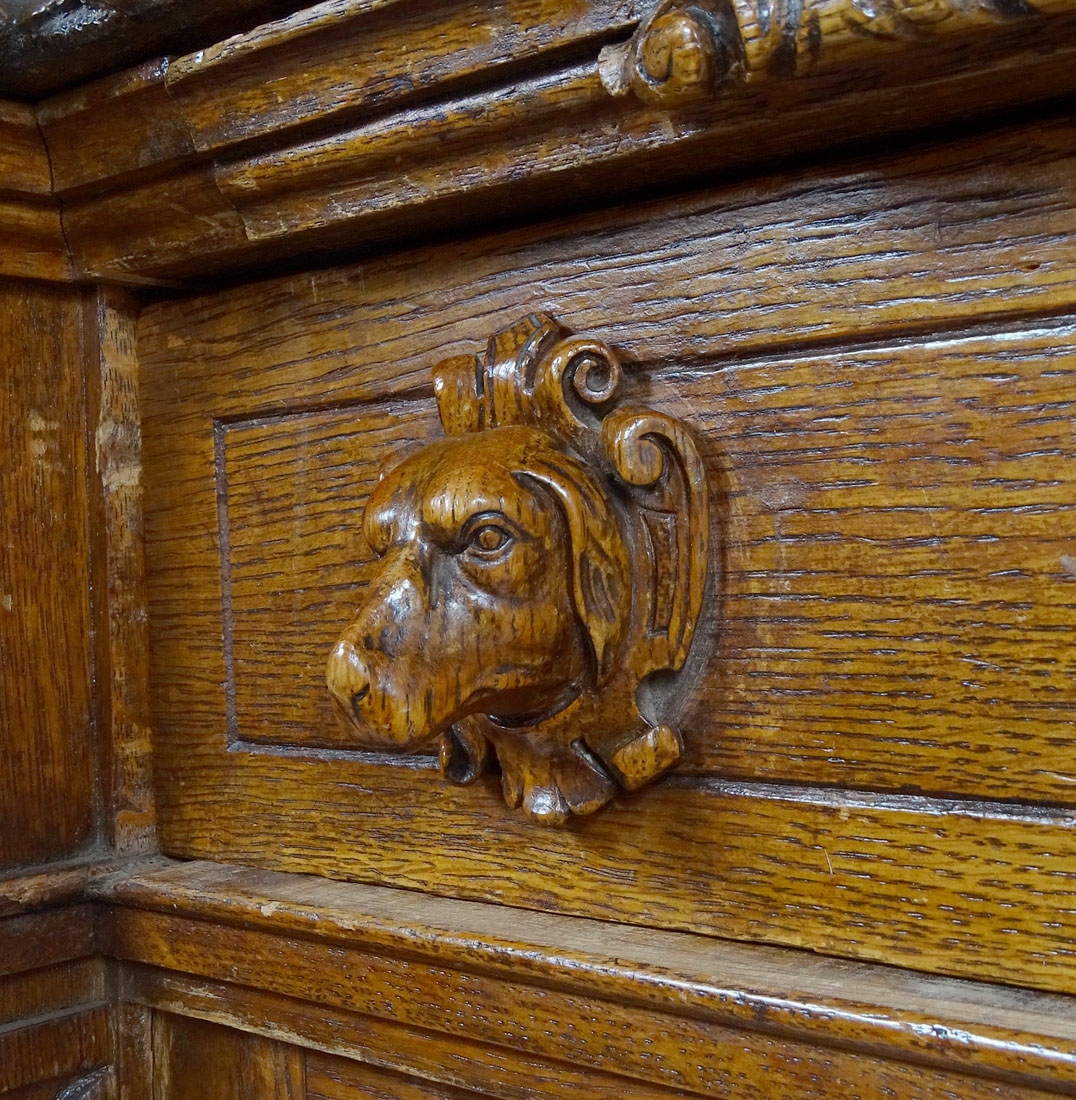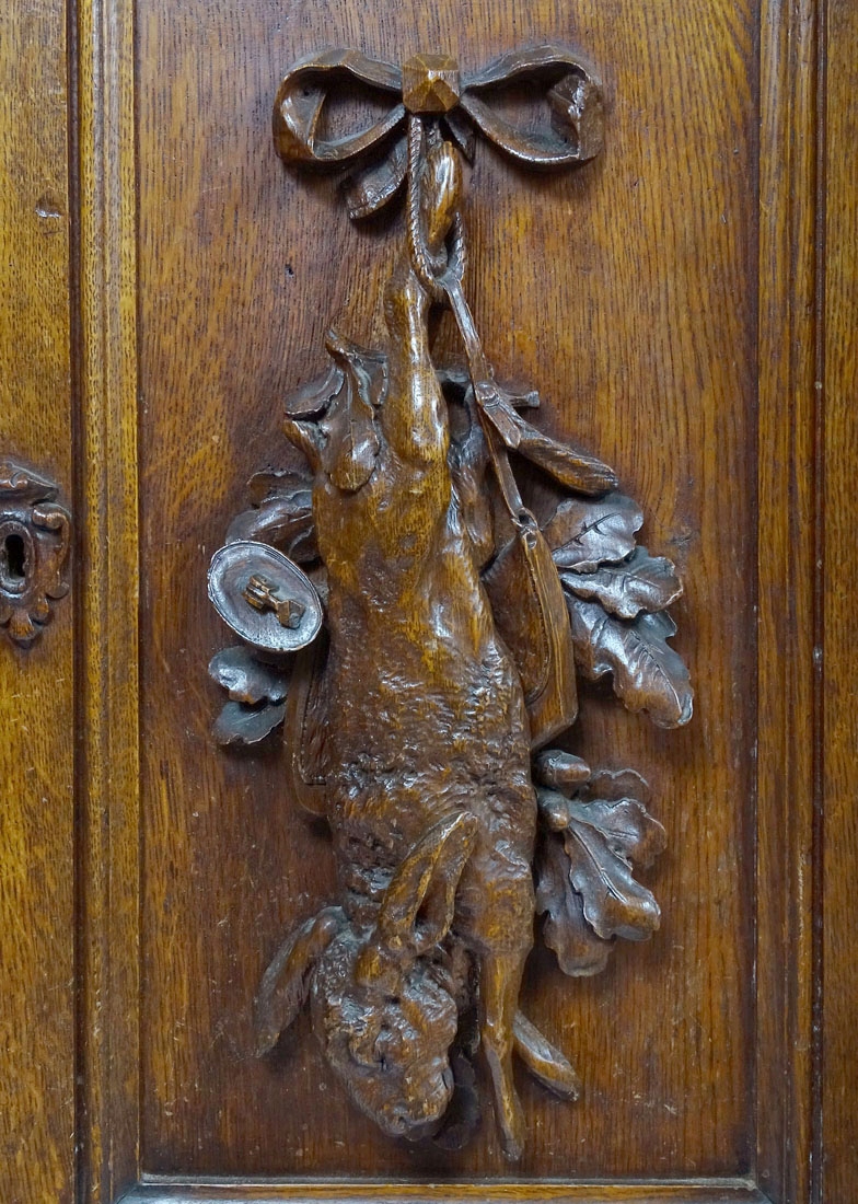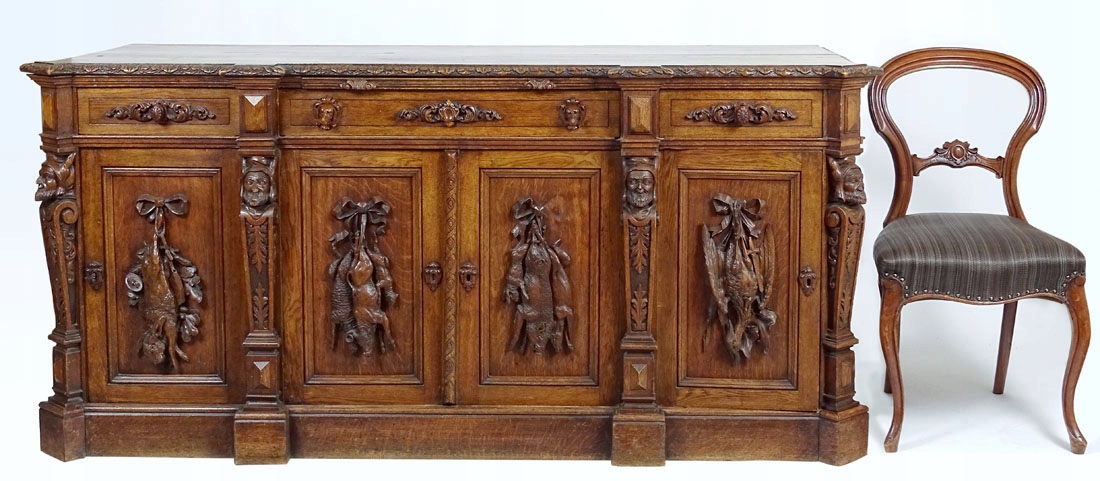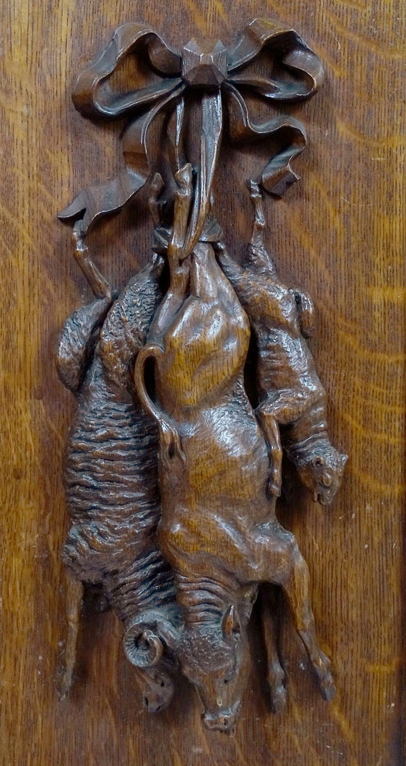 з простою конструкцією, закритий чотирма дверними полотнами, з трьома ящиками під стільницею, що підтримується широкою планкою. Стільниця з виступаючими по кутах і двома спереду по всій довжині різьбленими елементами. Знизу розташована невелика висувна мармурова стільниця та ящики з дерев’яними різьбленими ручками. Дверцята меблів з прикрасами мисливських тварин, перев'язаних стрічками вгорі, а між ними прямокутні стовпи з маскаронами, розміщені на звужених донизу підставках, з кутовою колодкою внизу.