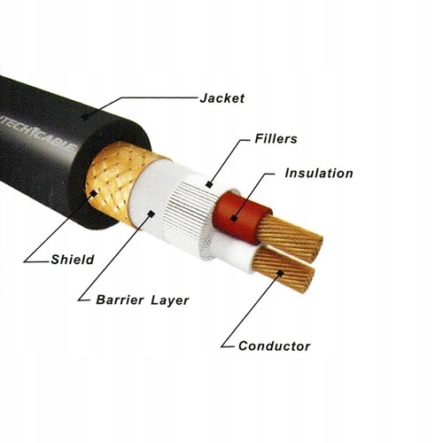 - дві жили, скручені разом з бавовняною вставкою, бар’єрний шар, обмотаний резонансною демпферною стрічкою