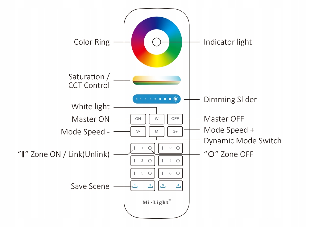 Багатозонний світлодіодний радіопульт із серії Mi-Light — це шестизонний світлодіодний контролер, який дозволяє індивідуально керувати кожною зоною за допомогою радіоприймача. Радіопульт можна використовувати для будь-якої світлодіодної установки, оскільки він дозволяє отримати будь-який колір RGB з активною зміною інтенсивності яскравості та колірної температури CCT. Можливість використання пульта в одноколірних або багатоколірних світлодіодних установках (MONO, CCT, RGB, RGBW, RGB+CCT)